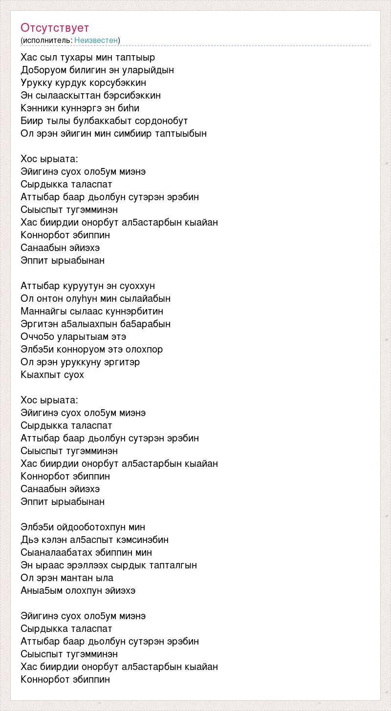 Хас сыл тухары мин таптыыр До5оруом билигин эн уларыйдын Урукку курдук корсубэккин Эн сылааскыттан бэрсибэккин Кэнники куннэргэ эн биhи Биир тылы булбаккабыт сордонобут Ол эрэн эйигин мин симбиир таптыыбын Хос ырыата: Эйигинэ суох оло5ум миэнэ Сырдыкка таласпат Аттыбар баар дьолбун сутэрэн эрэбин Сыыспыт тугэмминэн Хас биирдии онорбут ал5астарбын кыайан Коннорбот эбиппин Санаабын эйиэхэ Эппит ырыабынан Аттыбар куруутун эн суоххун Ол онтон олуhун мин сылайабын Маннайгы сылаас куннэрбитин Эргитэн а5алыахпын ба5арабын Оччо5о уларытыам этэ Элбэ5и конноруом этэ олохпор Ол эрэн уруккуну эргитэр Кыахпыт суох Хос ырыата: Эйигинэ суох оло5ум миэнэ Сырдыкка таласпат Аттыбар баар дьолбун сутэрэн эрэбин Сыыспыт тугэмминэн Хас биирдии онорбут ал5астарбын кыайан Коннорбот эбиппин Санаабын эйиэхэ Эппит ырыабынан Элбэ5и ойдооботохпун мин Дьэ кэлэн ал5аспыт кэмсинэбин Сыаналаабатах эбиппин мин Эн ыраас эрэллээх сырдык тапталгын Ол эрэн мантан ыла Аныа5ым олохпун эйиэхэ Эйигинэ суох оло5ум миэнэ Сырдыкка таласпат Аттыбар баар дьолбун сутэрэн эрэбин Сыыспыт тугэмминэн Хас биирдии онорбут ал5астарбын кыайан Коннорбот эбиппин