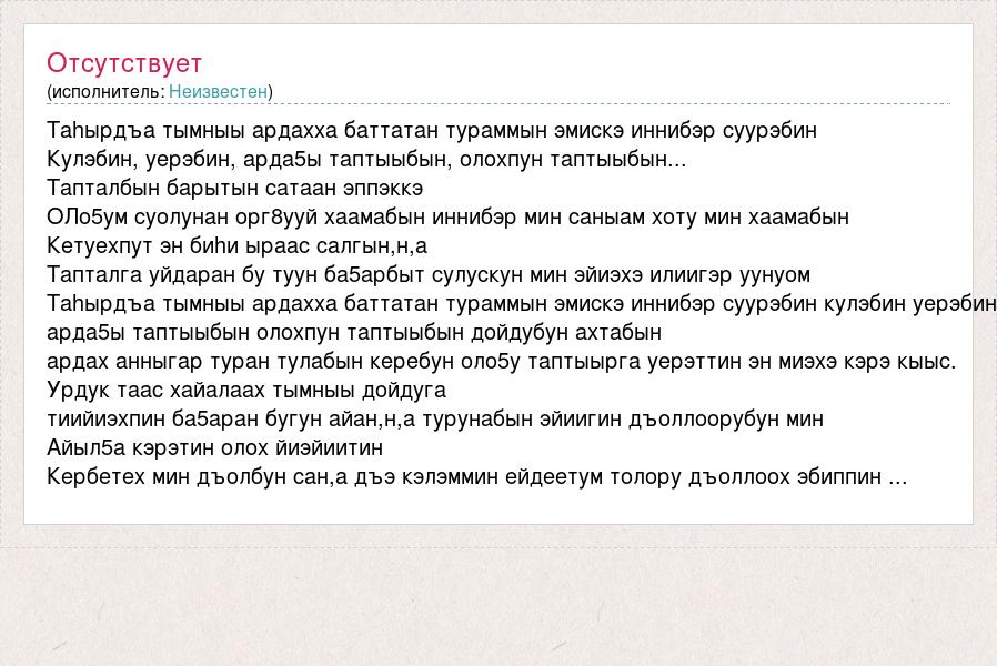 Таhырдъа тымныы ардахха баттатан тураммын эмискэ иннибэр суурэбин Кулэбин, уерэбин, арда5ы таптыыбын, олохпун таптыыбын... Тапталбын барытын сатаан эппэккэ ОЛо5ум суолунан орг8ууй хаамабын иннибэр мин саныам хоту мин хаамабын Кетуехпут эн биhи ыраас салгын,н,а Тапталга уйдаран бу туун ба5арбыт сулускун мин эйиэхэ илиигэр уунуом Таhырдъа тымныы ардахха баттатан тураммын эмискэ иннибэр суурэбин кулэбин уерэбин арда5ы таптыыбын олохпун таптыыбын дойдубун ахтабын ардах анныгар туран тулабын керебун оло5у таптыырга уерэттин эн миэхэ кэрэ кыыс. Урдук таас хайалаах тымныы дойдуга тиийиэхпин ба5аран бугун айан,н,а турунабын эйиигин дъоллоорубун мин Айыл5а кэрэтин олох йиэйиитин Кербетех мин дъолбун сан,а дъэ кэлэммин ейдеетум толору дъоллоох эбиппин ...