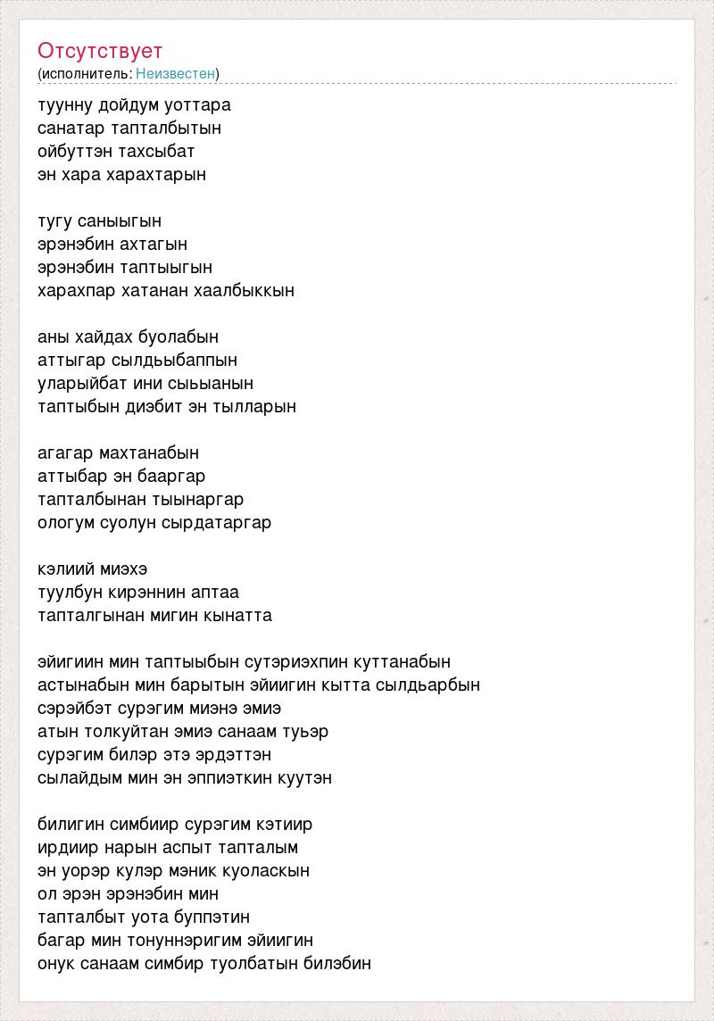 туунну дойдум уоттара санатар тапталбытын ойбуттэн тахсыбат эн хара харахтарын тугу саныыгын эрэнэбин ахтагын эрэнэбин таптыыгын харахпар хатанан хаалбыккын аны хайдах буолабын аттыгар сылдьыбаппын уларыйбат ини сыьыанын таптыбын диэбит эн тылларын агагар махтанабын аттыбар эн бааргар тапталбынан тыынаргар ологум суолун сырдатаргар кэлиий миэхэ туулбун кирэннин аптаа тапталгынан мигин кынатта эйигиин мин таптыыбын сутэриэхпин куттанабын астынабын мин барытын эйиигин кытта сылдьарбын сэрэйбэт сурэгим миэнэ эмиэ атын толкуйтан эмиэ санаам туьэр сурэгим билэр этэ эрдэттэн сылайдым мин эн эппиэткин куутэн билигин симбиир сурэгим кэтиир ирдиир нарын аспыт тапталым эн уорэр кулэр мэник куоласкын ол эрэн эрэнэбин мин тапталбыт уота буппэтин багар мин тонуннэригим эйиигин онук санаам симбир туолбатын билэбин