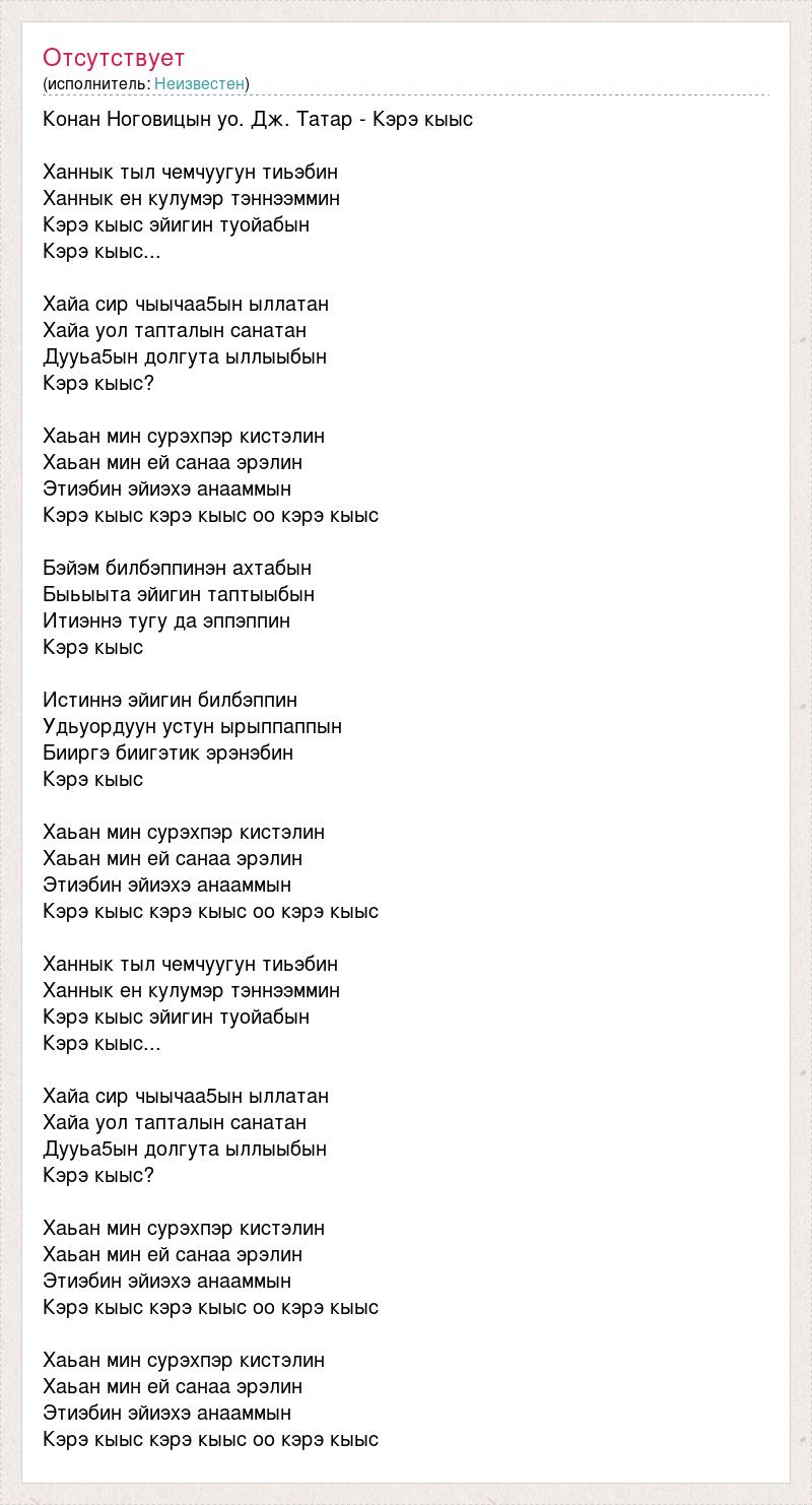 Конан Ноговицын уо. Дж. Татар - Кэрэ кыыс Ханнык тыл чемчуугун тиьэбин Ханнык ен кулумэр тэннээммин Кэрэ кыыс эйигин туойабын Кэрэ кыыс... Хайа сир чыычаа5ын ыллатан Хайа уол тапталын санатан Дууьа5ын долгута ыллыыбын Кэрэ кыыс? Хаьан мин сурэхпэр кистэлин Хаьан мин ей санаа эрэлин Этиэбин эйиэхэ анааммын Кэрэ кыыс кэрэ кыыс оо кэрэ кыыс Бэйэм билбэппинэн ахтабын Быьыыта эйигин таптыыбын Итиэннэ тугу да эппэппин Кэрэ кыыс Истиннэ эйигин билбэппин Удьуордуун устун ырыппаппын Бииргэ биигэтик эрэнэбин Кэрэ кыыс Хаьан мин сурэхпэр кистэлин Хаьан мин ей санаа эрэлин Этиэбин эйиэхэ анааммын Кэрэ кыыс кэрэ кыыс оо кэрэ кыыс Ханнык тыл чемчуугун тиьэбин Ханнык ен кулумэр тэннээммин Кэрэ кыыс эйигин туойабын Кэрэ кыыс... Хайа сир чыычаа5ын ыллатан Хайа уол тапталын санатан Дууьа5ын долгута ыллыыбын Кэрэ кыыс? Хаьан мин сурэхпэр кистэлин Хаьан мин ей санаа эрэлин Этиэбин эйиэхэ анааммын Кэрэ кыыс кэрэ кыыс оо кэрэ кыыс Хаьан мин сурэхпэр кистэлин Хаьан мин ей санаа эрэлин Этиэбин эйиэхэ анааммын Кэрэ кыыс кэрэ кыыс оо кэрэ кыыс