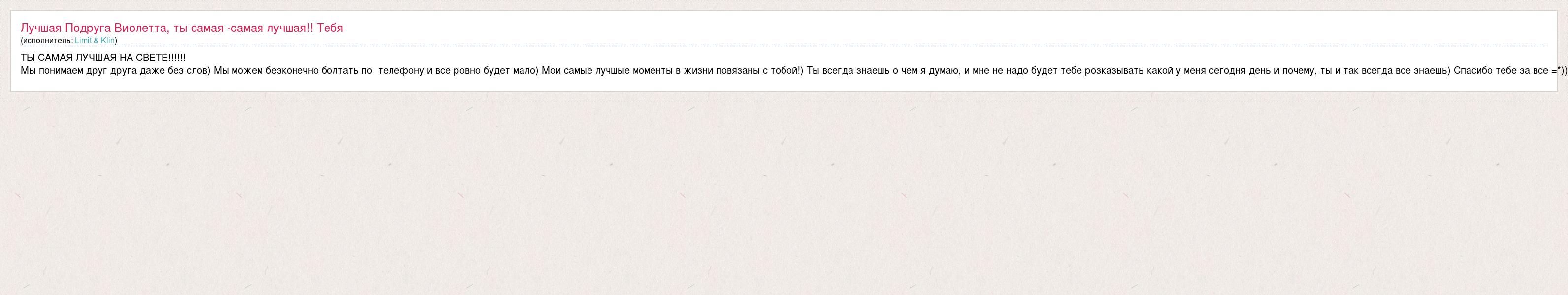 ТЫ САМАЯ ЛУЧШАЯ НА СВЕТЕ!!!!!! Мы понимаем друг друга даже без слов) Мы можем безконечно болтать по телефону и все ровно будет мало) Мои самые лучшые моменты в жизни повязаны с тобой!) Ты всегда знаешь о чем я думаю, и мне не надо будет тебе розказывать какой у меня сегодня день и почему, ты и так всегда все знаешь) Спасибо тебе за все =*))