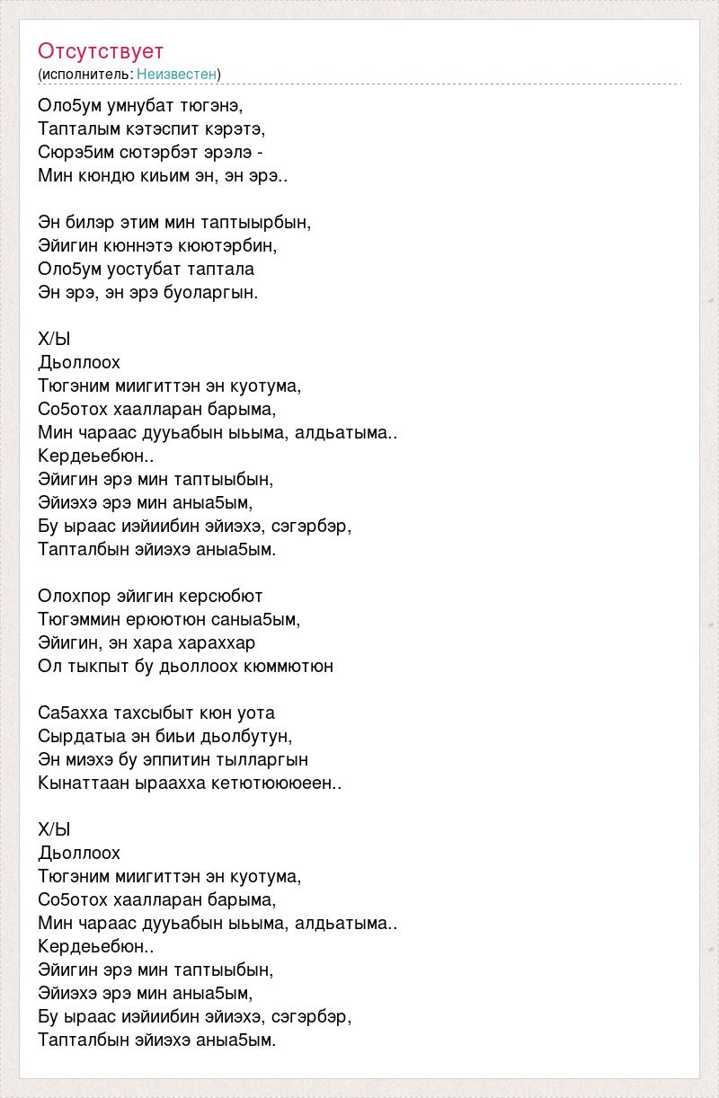 Оло5ум умнубат тюгэнэ, Тапталым кэтэспит кэрэтэ, Сюрэ5им сютэрбэт эрэлэ - Мин кюндю киьим эн, эн эрэ.. Эн билэр этим мин таптыырбын, Эйигин кюннэтэ кюютэрбин, Оло5ум уостубат таптала Эн эрэ, эн эрэ буоларгын. Х/Ы Дьоллоох Тюгэним миигиттэн эн куотума, Со5отох хаалларан барыма, Мин чараас дууьабын ыьыма, алдьатыма.. Кердеьебюн.. Эйигин эрэ мин таптыыбын, Эйиэхэ эрэ мин аныа5ым, Бу ыраас иэйиибин эйиэхэ, сэгэрбэр, Тапталбын эйиэхэ аныа5ым. Олохпор эйигин керсюбют Тюгэммин ерюютюн саныа5ым, Эйигин, эн хара хараххар Ол тыкпыт бу дьоллоох кюммютюн Са5ахха тахсыбыт кюн уота Сырдатыа эн биьи дьолбутун, Эн миэхэ бу эппитин тылларгын Кынаттаан ыраахха кетютюююеен.. Х/Ы Дьоллоох Тюгэним миигиттэн эн куотума, Со5отох хаалларан барыма, Мин чараас дууьабын ыьыма, алдьатыма.. Кердеьебюн.. Эйигин эрэ мин таптыыбын, Эйиэхэ эрэ мин аныа5ым, Бу ыраас иэйиибин эйиэхэ, сэгэрбэр, Тапталбын эйиэхэ аныа5ым.