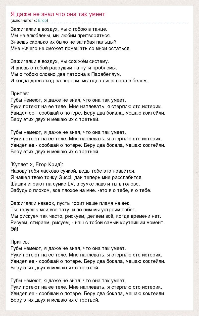 Зажигалки в воздух, мы с тобою в танце. Мы не влюблены, мы любим притворяться. Знаешь сколько их было не загибая пальцы? Мне ничего не сможет помешать со мной остаться. Зажигалки в воздух, мы сожжём систему. И вновь с тобой разрушим на пути проблемы. Мы с тобою словно два патрона в Парабеллум. И когда дресс-код на чёрном, мы одна лишь пара в белом. Припев: Губы немеют, я даже не знал, что она так умеет. Руки потеют на ее теле. Мне наплевать, я стерплю сто истерик. Увидел ее - сообщай о потере. Беру два бокала, мешаю коктейли. Беру этих двух и мешаю их с третьей. Губы немеют, я даже не знал, что она так умеет. Руки потеют на ее теле. Мне наплевать, я стерплю сто истерик. Увидел ее - сообщай о потере. Беру два бокала, мешаю коктейли. Беру этих двух и мешаю их с третьей. [Куплет 2, Егор Крид]: Назову тебя ласково сучкой, ведь тебе это нравится. Я нашел твою точку Gucci, дай теперь мне расслабится. Шашки играют на сумке LV, в сумке лавэ и ты в голове. Забудь о плохом, все плохое на мне. -это я о тебе, я о тебе. Зажигалки наверх, пусть горит наше пламя на век. Ты целуешь мои все тату, и по ним мы устроим побег. Мы рискуем так часто, рискуем, делаем всё, когда времени нет. Рисуем, стираем, рисуем, - наш с тобой самый крутейший момент. Эй! Припев: Губы немеют, я даже не знал, что она так умеет. Руки потеют на ее теле. Мне наплевать, я стерплю сто истерик. Увидел ее - сообщай о потере. Беру два бокала, мешаю коктейли. Беру этих двух и мешаю их с третьей. Губы немеют, я даже не знал, что она так умеет. Руки потеют на ее теле. Мне наплевать, я стерплю сто истерик. Увидел ее - сообщай о потере. Беру два бокала, мешаю коктейли. Беру этих двух и мешаю их с третьей.