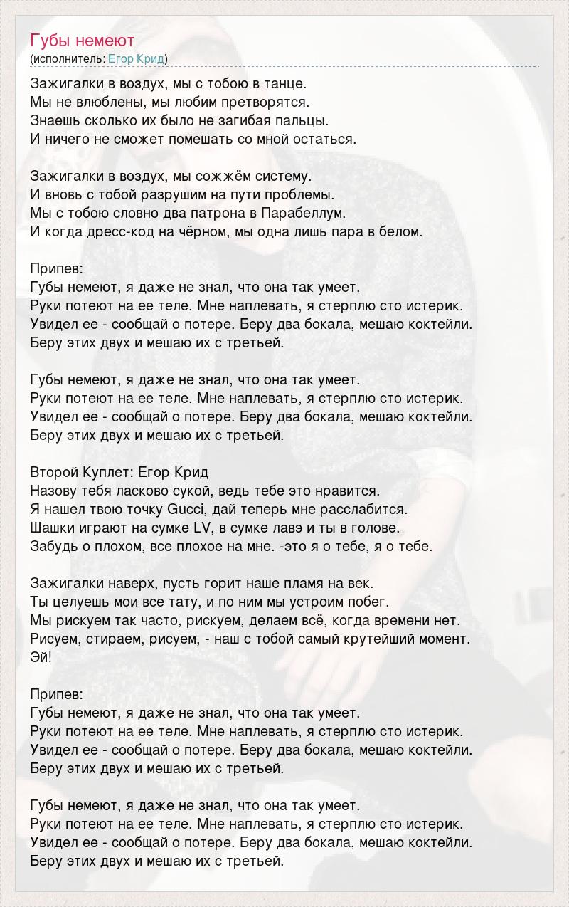 Зажигалки в воздух, мы с тобою в танце. Мы не влюблены, мы любим претворятся. Знаешь сколько их было не загибая пальцы. И ничего не сможет помешать со мной остаться. Зажигалки в воздух, мы сожжём систему. И вновь с тобой разрушим на пути проблемы. Мы с тобою словно два патрона в Парабеллум. И когда дресс-код на чёрном, мы одна лишь пара в белом. Припев: Губы немеют, я даже не знал, что она так умеет. Руки потеют на ее теле. Мне наплевать, я стерплю сто истерик. Увидел ее - сообщай о потере. Беру два бокала, мешаю коктейли. Беру этих двух и мешаю их с третьей. Губы немеют, я даже не знал, что она так умеет. Руки потеют на ее теле. Мне наплевать, я стерплю сто истерик. Увидел ее - сообщай о потере. Беру два бокала, мешаю коктейли. Беру этих двух и мешаю их с третьей. Второй Куплет: Егор Крид Назову тебя ласково сукой, ведь тебе это нравится. Я нашел твою точку Gucci, дай теперь мне расслабится. Шашки играют на сумке LV, в сумке лавэ и ты в голове. Забудь о плохом, все плохое на мне. -это я о тебе, я о тебе. Зажигалки наверх, пусть горит наше пламя на век. Ты целуешь мои все тату, и по ним мы устроим побег. Мы рискуем так часто, рискуем, делаем всё, когда времени нет. Рисуем, стираем, рисуем, - наш с тобой самый крутейший момент. Эй! Припев: Губы немеют, я даже не знал, что она так умеет. Руки потеют на ее теле. Мне наплевать, я стерплю сто истерик. Увидел ее - сообщай о потере. Беру два бокала, мешаю коктейли. Беру этих двух и мешаю их с третьей. Губы немеют, я даже не знал, что она так умеет. Руки потеют на ее теле. Мне наплевать, я стерплю сто истерик. Увидел ее - сообщай о потере. Беру два бокала, мешаю коктейли. Беру этих двух и мешаю их с третьей.