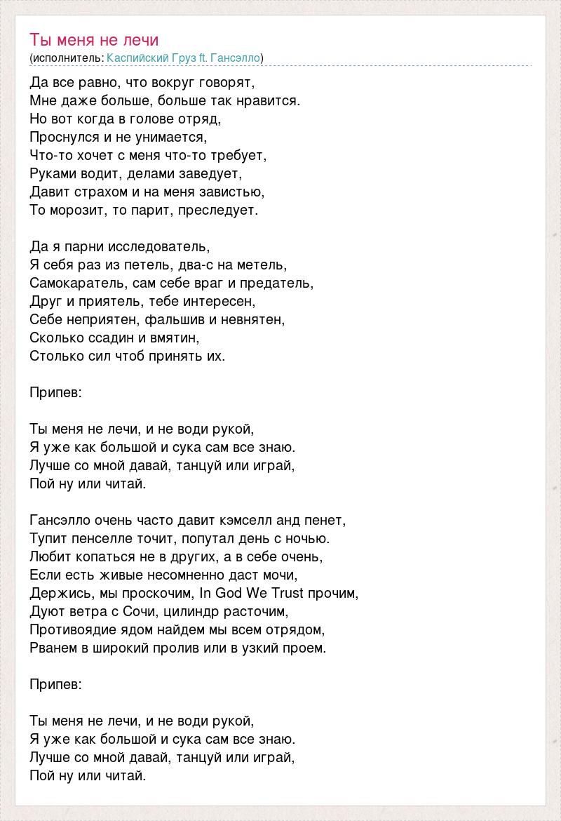 Да все равно, что вокруг говорят, Мне даже больше, больше так нравится. Но вот когда в голове отряд, Проснулся и не унимается, Что-то хочет с меня что-то требует, Руками водит, делами заведует, Давит страхом и на меня завистью, То морозит, то парит, преследует. Да я парни исследователь, Я себя раз из петель, два-с на метель, Самокаратель, сам себе враг и предатель, Друг и приятель, тебе интересен, Себе неприятен, фальшив и невнятен, Сколько ссадин и вмятин, Столько сил чтоб принять их. Припев: Ты меня не лечи, и не води рукой, Я уже как большой и сука сам все знаю. Лучше со мной давай, танцуй или играй, Пой ну или читай. Гансэлло очень часто давит кэмселл анд пенет, Тупит пенселле точит, попутал день с ночью. Любит копаться не в других, а в себе очень, Если есть живые несомненно даст мочи, Держись, мы проскочим, In God We Trust прочим, Дуют ветра с Сочи, цилиндр расточим, Противоядие ядом найдем мы всем отрядом, Рванем в широкий пролив или в узкий проем. Припев: Ты меня не лечи, и не води рукой, Я уже как большой и сука сам все знаю. Лучше со мной давай, танцуй или играй, Пой ну или читай.