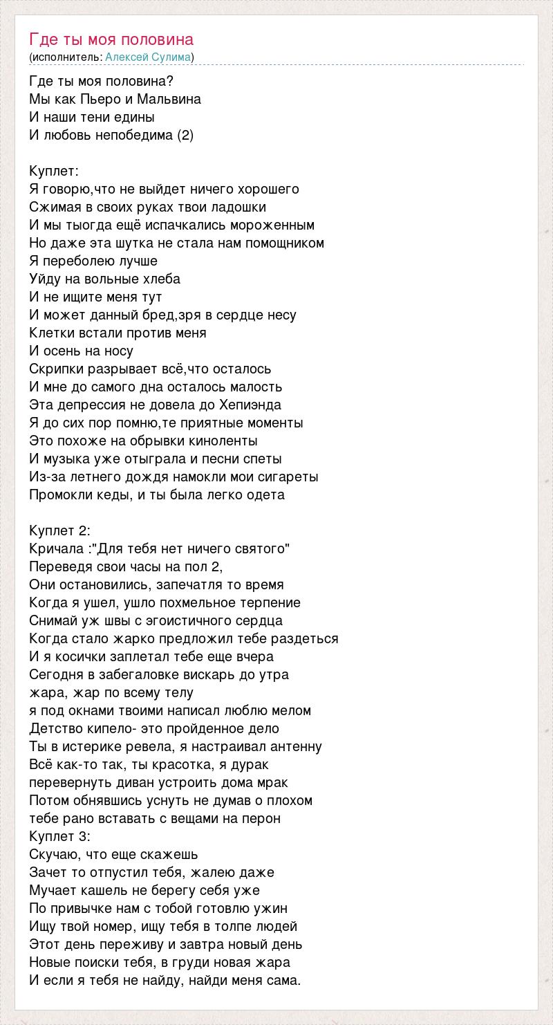 Где ты моя половина? Мы как Пьеро и Мальвина И наши тени едины И любовь непобедима (2) Куплет: Я говорю,что не выйдет ничего хорошего Сжимая в своих руках твои ладошки И мы тыогда ещё испачкались мороженным Но даже эта шутка не стала нам помощником Я переболею лучше Уйду на вольные хлеба И не ищите меня тут И может данный бред,зря в сердце несу Клетки встали против меня И осень на носу Скрипки разрывает всё,что осталось И мне до самого дна осталось малость Эта депрессия не довела до Хепиэнда Я до сих пор помню,те приятные моменты Это похоже на обрывки киноленты И музыка уже отыграла и песни спеты Из-за летнего дождя намокли мои сигареты Промокли кеды, и ты была легко одета Куплет 2: Кричала :"Для тебя нет ничего святого" Переведя свои часы на пол 2, Они остановились, запечатля то время Когда я ушел, ушло похмельное терпение Снимай уж швы с эгоистичного сердца Когда стало жарко предложил тебе раздеться И я косички заплетал тебе еще вчера Сегодня в забегаловке вискарь до утра жара, жар по всему телу я под окнами твоими написал люблю мелом Детство кипело- это пройденное дело Ты в истерике ревела, я настраивал антенну Всё как-то так, ты красотка, я дурак перевернуть диван устроить дома мрак Потом обнявшись уснуть не думав о плохом тебе рано вставать с вещами на перон Куплет 3: Скучаю, что еще скажешь Зачет то отпустил тебя, жалею даже Мучает кашель не берегу себя уже По привычке нам с тобой готовлю ужин Ищу твой номер, ищу тебя в толпе людей Этот день переживу и завтра новый день Новые поиски тебя, в груди новая жара И если я тебя не найду, найди меня сама.