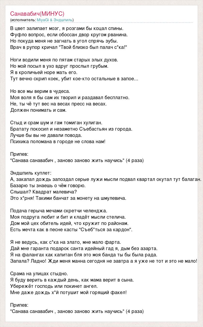 В цвет залипает мозг, я розгами бы коцал спины. Фуфло вопрос, если обоссан двор кругом рванина. Но покуда меня не загнать в угол спрячь зубы. Врач в рупор кричал "Твой близко был палач с*ка!" Ноги водили меня по пятам старых злых духов. Но мой посыл в ухо вдруг прослыл грубым. Я в кроличьей норе мать его. Тут вечно скрип коек, убит кое-кто остальные в запое... Но все мы верим в чудеса. Моя воля я бы сам их творил и раздавал бесплатно. Не, ты чё тут вес на весах пресс на весах. Должен понимать и сам. Стыд и срам шум и гам томиган хулиган. Братату покосил и незаметно Съебастьян из города. Лучше бы вы не давали повода. Психика поломана в городе не слова нам! Припев: "Санава санавабич , заново заново жить научись" (4 раза) Эндшпиль куплет: А, закапал дождь запоздал серые лужи мысли подвал квартал окутал тут балаган. Базарю ты знаешь о чём говорю. Слышал? Квадрат малевича? Это х*рня! Такими банчат за монету на шмулевича. Подача герыча мечами скретчи челенджа. Моя подруга любит и бит и кладёт мысли стелича. Дом мой цех обитель идей, что кружит по районам. Есть мечта как в песне касты "Съеб*ться за кардон". Я не ведусь, как с*ка на злато, мне мало фарта. Дай мне гаранта подарок санта идейный гад я, дым без азарта. Я на фалангах как капитан бля это моя банда ты бы была рада. Запала? Ладно! Жди меня манна сегодня не завтра а я уже не тот и это не мало! Срама на улицах стыдно. Я буду верить в каждый день, как мама верит в сына. Убережёт господь или покинет ангел. Мне даже дождь х*й потушит мой горящий факел! Припев: "Санава санавабич , заново заново жить научись" (4 раза)