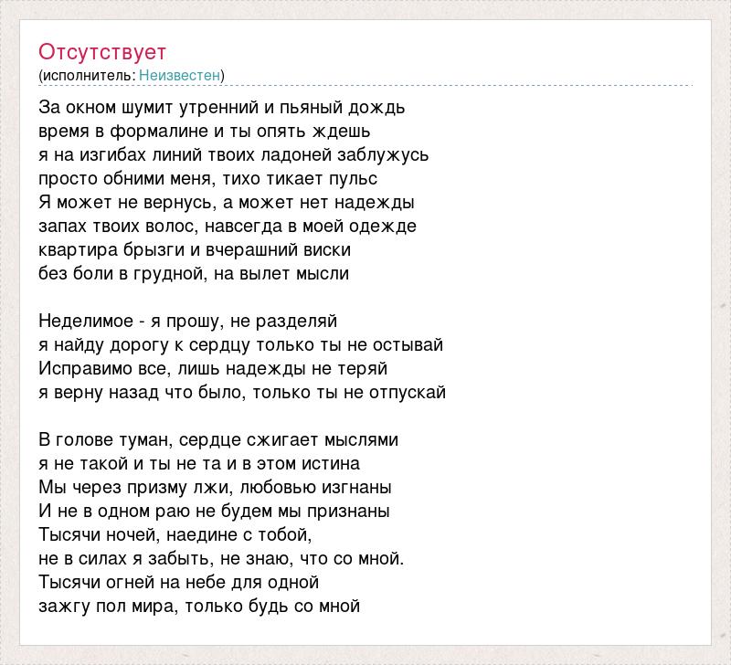 За окном шумит утренний и пьяный дождь время в формалине и ты опять ждешь я на изгибах линий твоих ладоней заблужусь просто обними меня, тихо тикает пульс Я может не вернусь, а может нет надежды запах твоих волос, навсегда в моей одежде квартира брызги и вчерашний виски без боли в грудной, на вылет мысли Неделимое - я прошу, не разделяй я найду дорогу к сердцу только ты не остывай Исправимо все, лишь надежды не теряй я верну назад что было, только ты не отпускай В голове туман, сердце сжигает мыслями я не такой и ты не та и в этом истина Мы через призму лжи, любовью изгнаны И не в одном раю не будем мы признаны Тысячи ночей, наедине с тобой, не в силах я забыть, не знаю, что со мной. Тысячи огней на небе для одной зажгу пол мира, только будь со мной