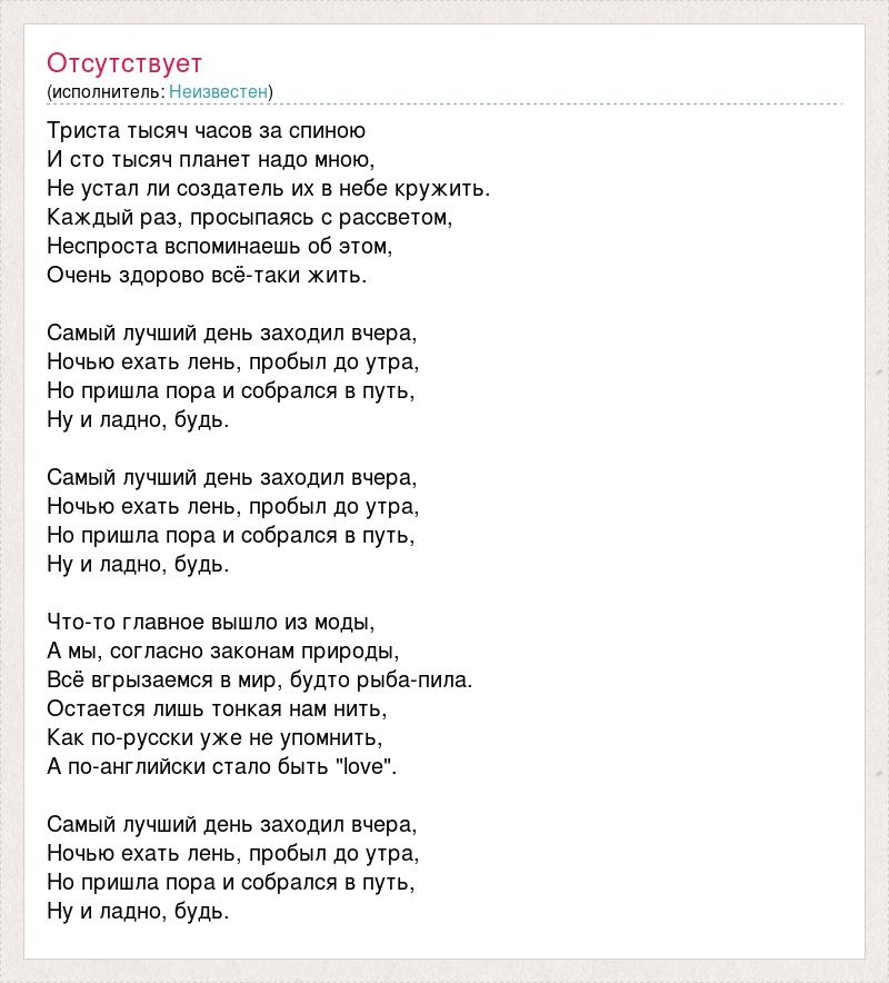 Триста тысяч часов за спиною И сто тысяч планет надо мною, Не устал ли создатель их в небе кружить. Каждый раз, просыпаясь с рассветом, Неспроста вспоминаешь об этом, Очень здорово всё-таки жить. Самый лучший день заходил вчера, Ночью ехать лень, пробыл до утра, Но пришла пора и собрался в путь, Ну и ладно, будь. Самый лучший день заходил вчера, Ночью ехать лень, пробыл до утра, Но пришла пора и собрался в путь, Ну и ладно, будь. Что-то главное вышло из моды, А мы, согласно законам природы, Всё вгрызаемся в мир, будто рыба-пила. Остается лишь тонкая нам нить, Как по-русски уже не упомнить, А по-английски стало быть "love". Самый лучший день заходил вчера, Ночью ехать лень, пробыл до утра, Но пришла пора и собрался в путь, Ну и ладно, будь.