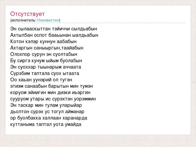 Эн сылааскыттан тэйиччи сылдьабын Ахтыл5ан оспот бааьынан ыалдьабын Котон кэлэр куннун аа5абын Ахтаргын саныыргын,таайабын Олохпор сурун эн суолта5ын Бу сиргэ кунум ыйым буола5ын Эн суоххар тыынарым аччаата Сурэ5им таптала суох ытаата Оо хаьан уунэрий ол тугэн этиэм санаабын барытын мин тумэн коруом эйиигин мин диэки иьэргин сууруом утары ис сурэхтэн уорэммин Эн таскар мин тулам уларыйар дьолтон сурэх ус тогул айманар ор буолбакка халлаан харанарда куттаныма таптал уота умайда