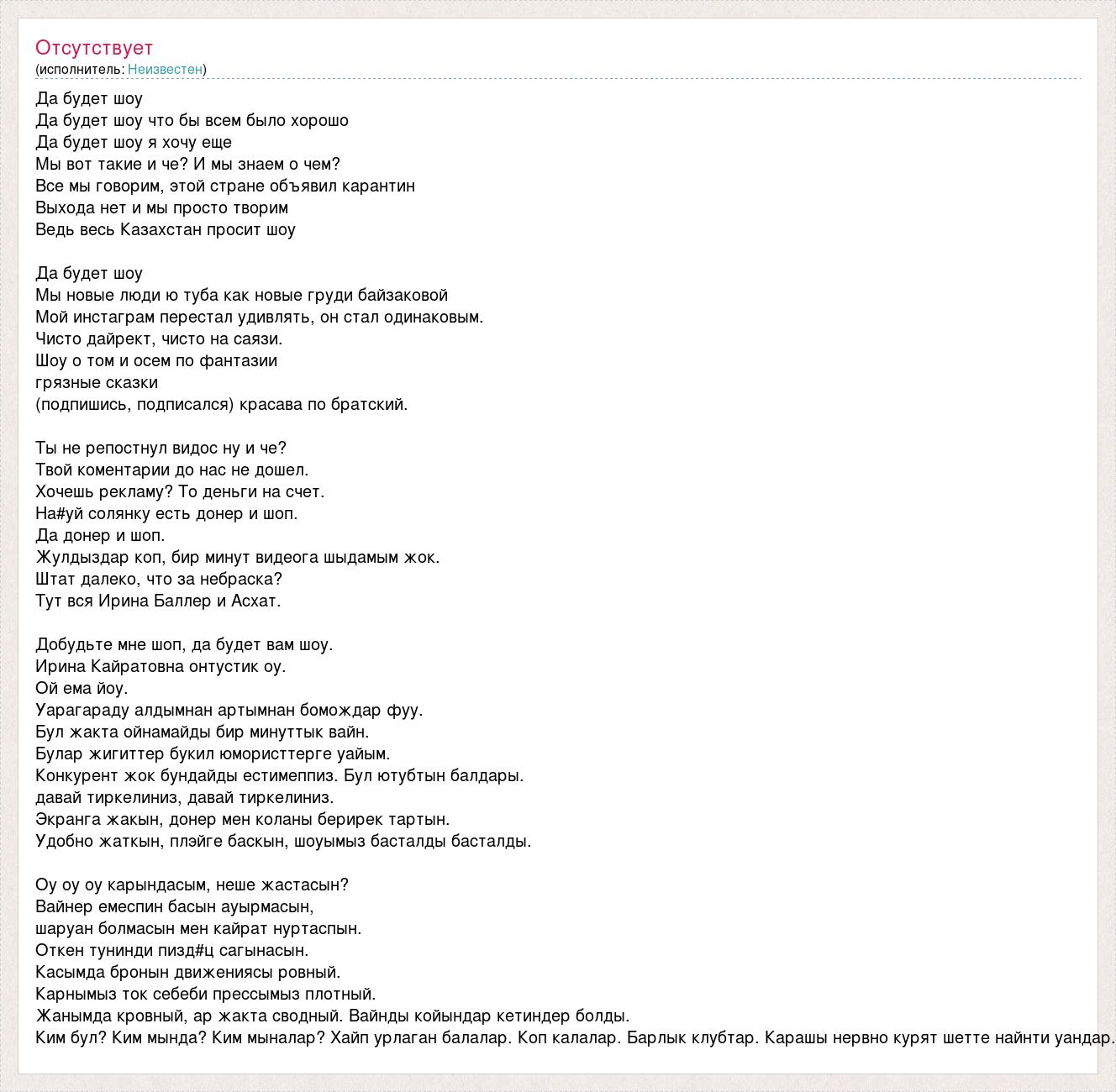 Да будет шоу Да будет шоу что бы всем было хорошо Да будет шоу я хочу еще Мы вот такие и че? И мы знаем о чем? Все мы говорим, этой стране объявил карантин Выхода нет и мы просто творим Ведь весь Казахстан просит шоу Да будет шоу Мы новые люди ю туба как новые груди байзаковой Мой инстаграм перестал удивлять, он стал одинаковым. Чисто дайрект, чисто на саязи. Шоу о том и осем по фантазии грязные сказки (подпишись, подписался) красава по братский. Ты не репостнул видос ну и че? Твой коментарии до нас не дошел. Хочешь рекламу? То деньги на счет. На#уй солянку есть донер и шоп. Да донер и шоп. Жулдыздар коп, бир минут видеога шыдамым жок. Штат далеко, что за небраска? Тут вся Ирина Баллер и Асхат. Добудьте мне шоп, да будет вам шоу. Ирина Кайратовна онтустик оу. Ой ема йоу. Уарагараду алдымнан артымнан бомождар фуу. Бул жакта ойнамайды бир минуттык вайн. Булар жигиттер букил юмористтерге уайым. Конкурент жок бундайды естимеппиз. Бул ютубтын балдары. давай тиркелиниз, давай тиркелиниз. Экранга жакын, донер мен коланы берирек тартын. Удобно жаткын, плэйге баскын, шоуымыз басталды басталды. Оу оу оу карындасым, неше жастасын? Вайнер емеспин басын ауырмасын, шаруан болмасын мен кайрат нуртаспын. Откен тунинди пизд#ц сагынасын. Касымда бронын движениясы ровный. Карнымыз ток себеби прессымыз плотный. Жанымда кровный, ар жакта сводный. Вайнды койындар кетиндер болды. Ким бул? Ким мында? Ким мыналар? Хайп урлаган балалар. Коп калалар. Барлык клубтар. Карашы нервно курят шетте найнти уандар.