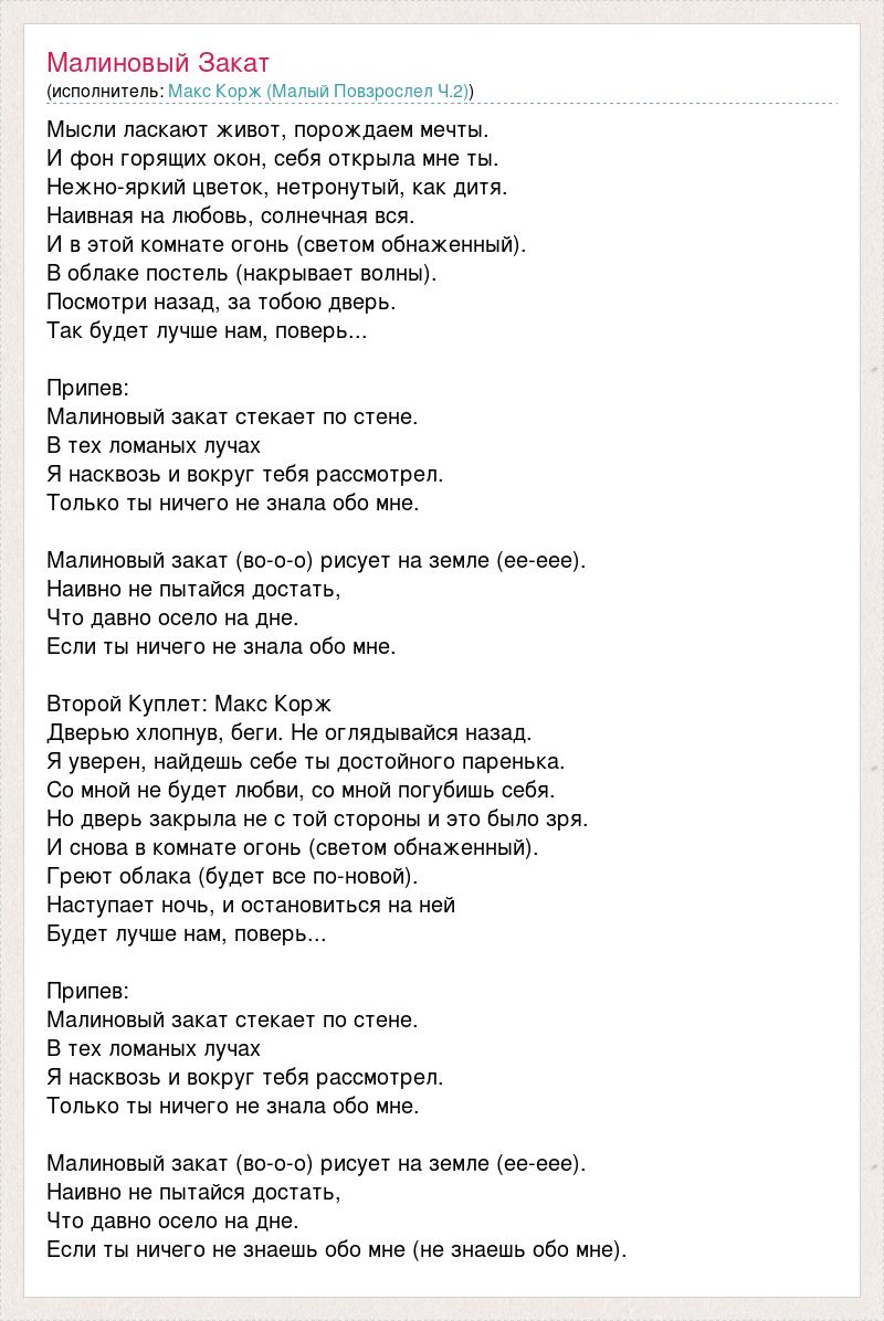 Мысли ласкают живот, порождаем мечты. И фон горящих окон, себя открыла мне ты. Нежно-яркий цветок, нетронутый, как дитя. Наивная на любовь, солнечная вся. И в этой комнате огонь (светом обнаженный). В облаке постель (накрывает волны). Посмотри назад, за тобою дверь. Так будет лучше нам, поверь... Припев: Малиновый закат стекает по стене. В тех ломаных лучах Я насквозь и вокруг тебя рассмотрел. Только ты ничего не знала обо мне. Малиновый закат (во-о-о) рисует на земле (ее-еее). Наивно не пытайся достать, Что давно осело на дне. Если ты ничего не знала обо мне. Второй Куплет: Макс Корж Дверью хлопнув, беги. Не оглядывайся назад. Я уверен, найдешь себе ты достойного паренька. Со мной не будет любви, со мной погубишь себя. Но дверь закрыла не с той стороны и это было зря. И снова в комнате огонь (светом обнаженный). Греют облака (будет все по-новой). Наступает ночь, и остановиться на ней Будет лучше нам, поверь... Припев: Малиновый закат стекает по стене. В тех ломаных лучах Я насквозь и вокруг тебя рассмотрел. Только ты ничего не знала обо мне. Малиновый закат (во-о-о) рисует на земле (ее-еее). Наивно не пытайся достать, Что давно осело на дне. Если ты ничего не знаешь обо мне (не знаешь обо мне).