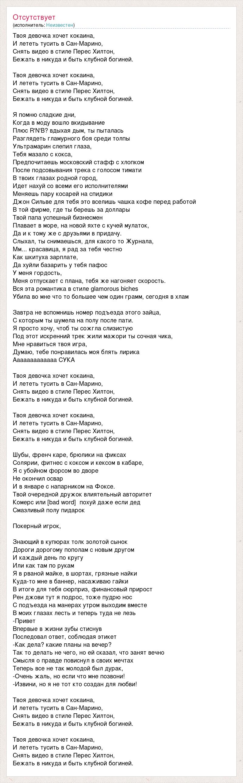 Твоя девочка хочет кокаина, И лететь тусить в Сан-Марино, Снять видео в стиле Перес Хилтон, Бежать в никуда и быть клубной богиней. Твоя девочка хочет кокаина, И лететь тусить в Сан-Марино, Снять видео в стиле Перес Хилтон, Бежать в никуда и быть клубной богиней. Я помню сладкие дни, Когда в моду вошло вкидывание Плюс R'N'B? вдыхая дым, ты пыталась Разглядеть гламурного боя среди толпы Ультрамарин слепил глаза, Тебя мазало с кокса, Предпочитаешь московский стафф с хлопком После подсовывания трека с голосом тимати В твоих глазах родной город, Идет нахуй со всеми его исполнителями Меняешь пару косарей на спидики Джон Сильве для тебя это вселишь чашка кофе перед работой В той фирме, где ты берешь за доллары Твой папа успешный бизнесмен Плавает в море, на новой яхте с кучей мулаток, Да и к тому же с друзьями в придачу. Слыхал, ты снимаешься, для какого то Журнала, Мм... красавица, я рад за тебя честно Как шкитуха зарплате, Да хуйли базарить у тебя пафос У меня гордость, Меня отпускает с плана, тебя же нагоняет скорость. Вся эта романтика в стиле glamorous biches Убила во мне что то большее чем один грамм, сегодня в хлам Завтра не вспомнишь номер подъезда этого зайца, С которым ты шумела на полу после пати. Я просто хочу, чтоб ты сожгла слизистую Под этот искренний трек жили мажори ты сочная чика, Мне нравиться твоя игра, Думаю, тебе понравилась моя блять лирика Ааааааааааааа СУКА Твоя девочка хочет кокаина, И лететь тусить в Сан-Марино, Снять видео в стиле Перес Хилтон, Бежать в никуда и быть клубной богиней. Твоя девочка хочет кокаина, И лететь тусить в Сан-Марино, Снять видео в стиле Перес Хилтон, Бежать в никуда и быть клубной богиней. Шубы, френч каре, брюлики на фиксах Солярии, фитнес с коксом и кексом в кабаре, Я с убойном форсом во дворе Не окончил освар И в январе с напарником на Фоксе. Твой очередной дружок влиятельный авторитет Комерс или [bad word] похуй даже если дед Смазливый полу пидарок Покерный игрок, Знающий в купюрах толк золотой сынок Дороги дорогому пополам с новым другом И каждый день по кругу Или как там по рукам Я в рваной майке, в шортах, грязные найки Куда-то мне в баннер, насаживаю гайки В итоге для тебя сюрприз, финансовый прирост Рен джови тут я подрос, тоже пудрю нос С подъезда на манерах утром выходим вместе В моих глазах лесть и теперь туда не лезь -Привет Впервые в жизни зубы стиснув Последовал ответ, соблюдая этикет -Как дела? какие планы на вечер? Так то делать не чего, но ей сказал, что занят вечно Смысля о правде повиснул в своих мечтах Теперь все не так молодой был дурак, -Очень жаль, но если что мне позвони! -Извини, но я не тот кто создан для любви! Твоя девочка хочет кокаина, И лететь тусить в Сан-Марино, Снять видео в стиле Перес Хилтон, Бежать в никуда и быть клубной богиней. Твоя девочка хочет кокаина, И лететь тусить в Сан-Марино, Снять видео в стиле Перес Хилтон, Бежать в никуда и быть клубной богиней.