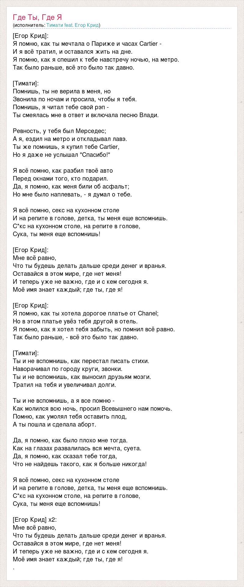[Егор Крид]: Я помню, как ты мечтала о Париже и часах Cartier - И я всё тратил, и оставался жить на дне. Я помню, как я спешил к тебе навстречу ночью, на метро. Так было раньше, всё это было так давно. [Тимати]: Помнишь, ты не верила в меня, но Звонила по ночам и просила, чтобы я тебя. Помнишь, я читал тебе свой рэп - Ты смеялась мне в ответ и включала песню Влади. Ревность, у тебя был Мерседес; А я, ездил на метро и откладывал лавэ. Ты же помнишь, я купил тебе Cartier, Но я даже не услышал "Спасибо!" Я всё помню, как разбил твоё авто Перед окнами того, кто подарил. Да, я помню, как меня били об асфальт; Но мне было наплевать, - я думал о тебе. Я всё помню, секс на кухонном столе И на репите в голове, детка, ты меня еще вспомнишь. С*кс на кухонном столе, на репите в голове, Сука, ты меня еще вспомнишь! [Егор Крид]: Мне всё равно, Что ты будешь делать дальше среди денег и вранья. Оставайся в этом мире, где нет меня! И теперь уже не важно, где и с кем сегодня я. Моё имя знает каждый; где ты, где я! [Егор Крид]: Я помню, как ты хотела дорогое платье от Chanel; Но в этом платье увёз тебя другой в отель. Я помню, как я хотел тебя забыть, но помнил всё равно. Так было раньше, - всё это было так давно. [Тимати]: Ты и не вспомнишь, как перестал писать стихи. Наворачивал по городу круги, звонки. Ты и не вспомнишь, как выносил друзьям мозги. Тратил на тебя и увеличивал долги. Ты и не вспомнишь, а я все помню - Как молился всю ночь, просил Всевышнего нам помочь. Помню, как умолял тебя оставить плод, А ты пошла и сделала аборт. Да, я помню, как было плохо мне тогда. Как на глазах развалилась вся мечта, суета. Да, я помню, как сказал тебе тогда, Что не найдешь такого, как я больше никогда! Я всё помню, секс на кухонном столе И на репите в голове, детка, ты меня еще вспомнишь. С*кс на кухонном столе, на репите в голове, Сука, ты меня еще вспомнишь! [Егор Крид] х2: Мне всё равно, Что ты будешь делать дальше среди денег и вранья. Оставайся в этом мире, где нет меня! И теперь уже не важно, где и с кем сегодня я. Моё имя знает каждый; где ты, где я! .