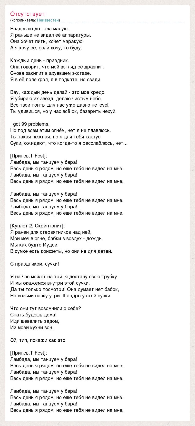 Раздеваю до гола малую. Я раньше не видал её аппаратуры. Она хочет пить, хочет маракую. А я хочу ее, если хочу, то буду. Каждый день - праздник. Она говорит, что мой взгляд её дразнит. Снова закипит в ахуевшем экстазе. Я в её поле фол, я в подкате, но сзади. Вау, каждый день делай - это мое кредо. Я убираю их звёзд, делаю чистым небо. Все твои понты для нас уже давно не level. Ты удивишся, но у нас всё ок, базарить нехуй. I got 99 problems, Но под всем этим огнём, нет я не плавлюсь. Ты такая нежная, но я для тебя кактус. Суки, ожидают, что когда-то я расслаблюсь, нет... [Припев,T-Fest]: Ламбада, мы танцуем у бара! Весь день я рядом, но еще тебя не видел на мне. Ламбада, мы танцуем у бара! Весь день я рядом, но еще тебя не видел на мне. Ламбада, мы танцуем у бара! Весь день я рядом, но еще тебя не видел на мне. Ламбада, мы танцуем у бара! Весь день я рядом, но еще тебя не видел на мне. [Куплет 2, Скриптонит]: Я ранен для стервятников над ней, Мой меч в огне, бабки в воздух - дождь. Мы как будто Иудеи. В сумке есть конфеты, но они не для детей. С праздником, сучки! Я на час может на три, я достану свою трубку И мы окажемся внутри этой сучки. Да ты только посмотри! Она думает нет бабок, На возьми пачку утри. Шандро у этой сучки. Что они тут возомнили о себе? Спать будешь дома! Иди шевелить задом, Из моей кухни вон. Эй, тип, покажи как это [Припев,T-Fest]: Ламбада, мы танцуем у бара! Весь день я рядом, но еще тебя не видел на мне. Ламбада, мы танцуем у бара! Весь день я рядом, но еще тебя не видел на мне. Ламбада, мы танцуем у бара! Весь день я рядом, но еще тебя не видел на мне. Ламбада, мы танцуем у бара! Весь день я рядом, но еще тебя не видел на мне.