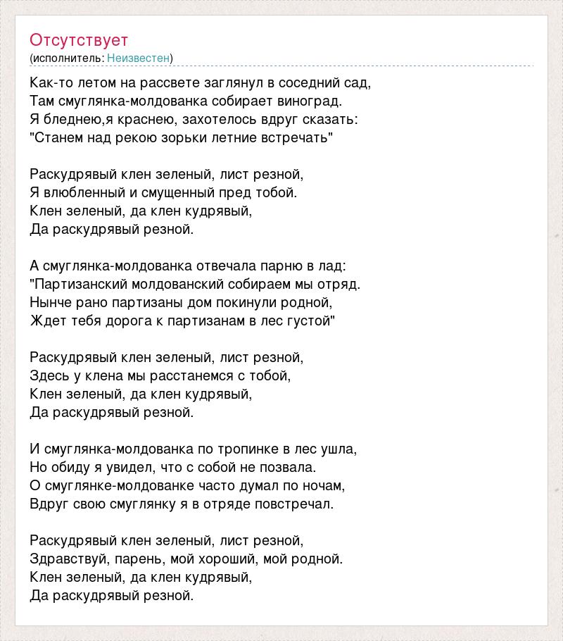Как-то летом на рассвете заглянул в соседний сад, Там смуглянка-молдованка собирает виноград. Я бледнею,я краснею, захотелось вдруг сказать: "Станем над рекою зорьки летние встречать" Раскудрявый клен зеленый, лист резной, Я влюбленный и смущенный пред тобой. Клен зеленый, да клен кудрявый, Да раскудрявый резной. А смуглянка-молдованка отвечала парню в лад: "Партизанский молдованский собираем мы отряд. Нынче рано партизаны дом покинули родной, Ждет тебя дорога к партизанам в лес густой" Раскудрявый клен зеленый, лист резной, Здесь у клена мы расстанемся с тобой, Клен зеленый, да клен кудрявый, Да раскудрявый резной. И смуглянка-молдованка по тропинке в лес ушла, Но обиду я увидел, что с собой не позвала. О смуглянке-молдованке часто думал по ночам, Вдруг свою смуглянку я в отряде повстречал. Раскудрявый клен зеленый, лист резной, Здравствуй, парень, мой хороший, мой родной. Клен зеленый, да клен кудрявый, Да раскудрявый резной.
