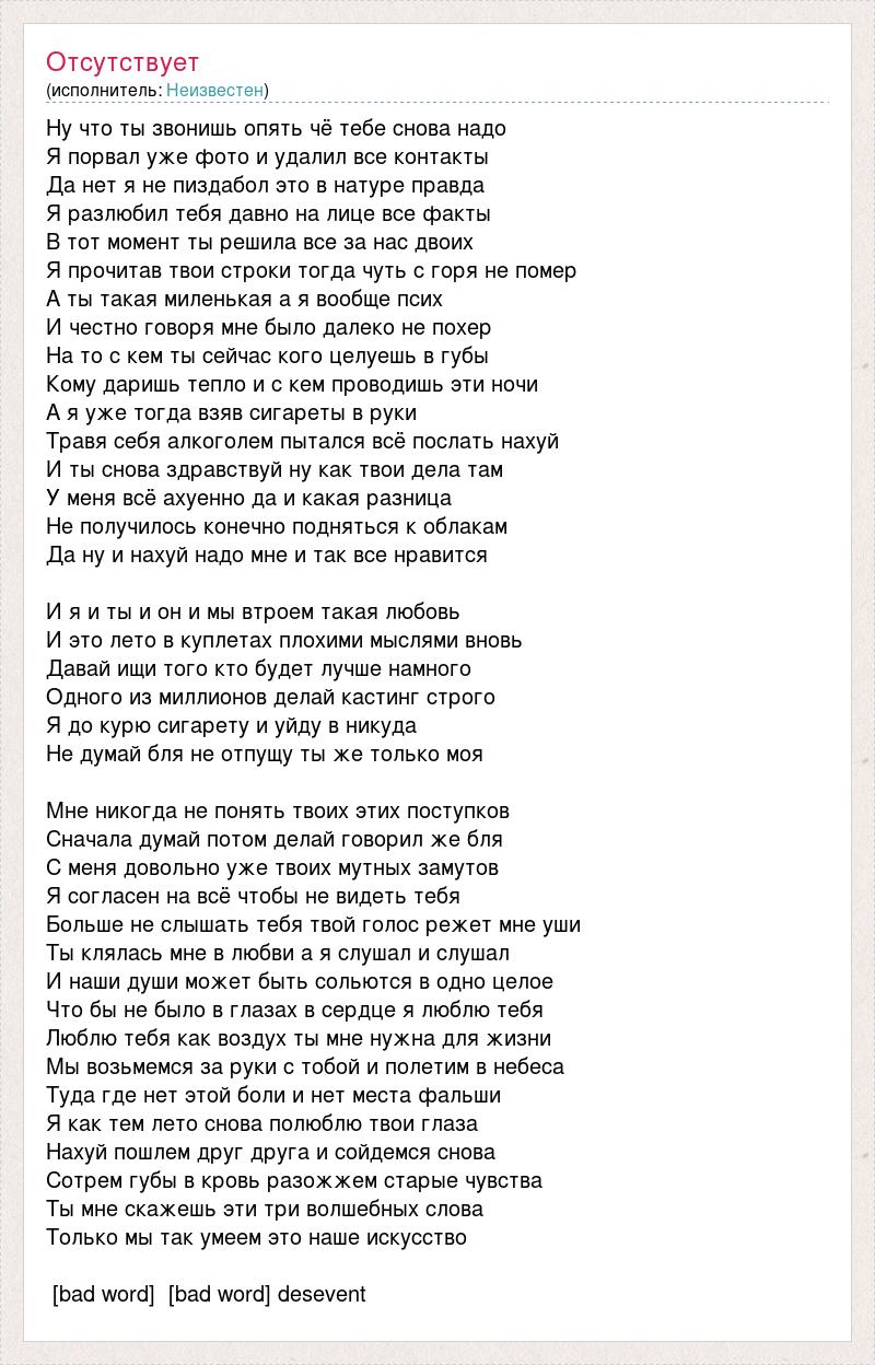 Ну что ты звонишь опять чё тебе снова надо Я порвал уже фото и удалил все контакты Да нет я не пиздабол это в натуре правда Я разлюбил тебя давно на лице все факты В тот момент ты решила все за нас двоих Я прочитав твои строки тогда чуть с горя не помер А ты такая миленькая а я вообще псих И честно говоря мне было далеко не похер На то с кем ты сейчас кого целуешь в губы Кому даришь тепло и с кем проводишь эти ночи А я уже тогда взяв сигареты в руки Травя себя алкоголем пытался всё послать нахуй И ты снова здравствуй ну как твои дела там У меня всё ахуенно да и какая разница Не получилось конечно подняться к облакам Да ну и нахуй надо мне и так все нравится И я и ты и он и мы втроем такая любовь И это лето в куплетах плохими мыслями вновь Давай ищи того кто будет лучше намного Одного из миллионов делай кастинг строго Я до курю сигарету и уйду в никуда Не думай бля не отпущу ты же только моя Мне никогда не понять твоих этих поступков Сначала думай потом делай говорил же бля С меня довольно уже твоих мутных замутов Я согласен на всё чтобы не видеть тебя Больше не слышать тебя твой голос режет мне уши Ты клялась мне в любви а я слушал и слушал И наши души может быть сольются в одно целое Что бы не было в глазах в сердце я люблю тебя Люблю тебя как воздух ты мне нужна для жизни Мы возьмемся за руки с тобой и полетим в небеса Туда где нет этой боли и нет места фальши Я как тем лето снова полюблю твои глаза Нахуй пошлем друг друга и сойдемся снова Сотрем губы в кровь разожжем старые чувства Ты мне скажешь эти три волшебных слова Только мы так умеем это наше искусство [bad word] [bad word] desevent