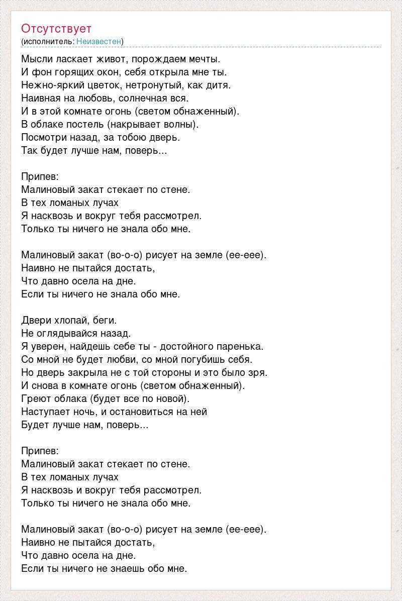 Мысли ласкает живот, порождаем мечты. И фон горящих окон, себя открыла мне ты. Нежно-яркий цветок, нетронутый, как дитя. Наивная на любовь, солнечная вся. И в этой комнате огонь (светом обнаженный). В облаке постель (накрывает волны). Посмотри назад, за тобою дверь. Так будет лучше нам, поверь... Припев: Малиновый закат стекает по стене. В тех ломаных лучах Я насквозь и вокруг тебя рассмотрел. Только ты ничего не знала обо мне. Малиновый закат (во-о-о) рисует на земле (ее-еее). Наивно не пытайся достать, Что давно осела на дне. Если ты ничего не знала обо мне. Двери хлопай, беги. Не оглядывайся назад. Я уверен, найдешь себе ты - достойного паренька. Со мной не будет любви, со мной погубишь себя. Но дверь закрыла не с той стороны и это было зря. И снова в комнате огонь (светом обнаженный). Греют облака (будет все по новой). Наступает ночь, и остановиться на ней Будет лучше нам, поверь... Припев: Малиновый закат стекает по стене. В тех ломаных лучах Я насквозь и вокруг тебя рассмотрел. Только ты ничего не знала обо мне. Малиновый закат (во-о-о) рисует на земле (ее-еее). Наивно не пытайся достать, Что давно осела на дне. Если ты ничего не знаешь обо мне.