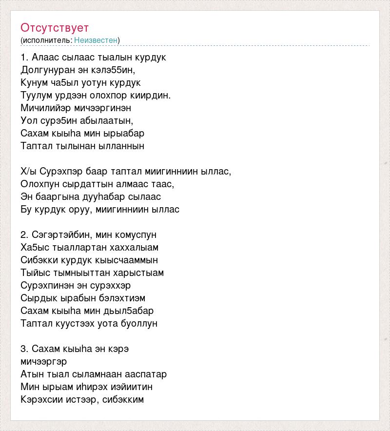 1. Алаас сылаас тыалын курдук Долгунуран эн кэлэ55ин, Кунум ча5ыл уотун курдук Туулум урдээн олохпор киирдин. Мичилийэр мичээргинэн Уол сурэ5ин абылаатын, Сахам кыыhа мин ырыабар Таптал тылынан ылланнын Х/ы Сурэхпэр баар таптал миигинниин ыллас, Олохпун сырдаттын алмаас таас, Эн бааргына дууhабар сылаас Бу курдук оруу, миигинниин ыллас 2. Сэгэртэйбин, мин комуспун Ха5ыс тыаллартан хаххалыам Сибэкки курдук кыысчааммын Тыйыс тымныыттан харыстыам Сурэхпинэн эн сурэххэр Сырдык ырабын бэлэхтиэм Сахам кыыhа мин дьыл5абар Таптал куустээх уота буоллун 3. Сахам кыыhа эн кэрэ мичээргэр Атын тыал сыламнаан ааспатар Мин ырыам иhирэх иэйиитин Кэрэхсии истээр, сибэкким
