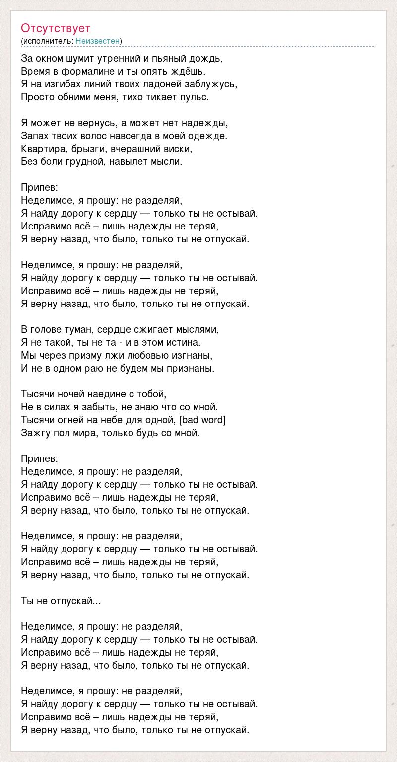 За окном шумит утренний и пьяный дождь, Время в формалине и ты опять ждёшь. Я на изгибах линий твоих ладоней заблужусь, Просто обними меня, тихо тикает пульс. Я может не вернусь, а может нет надежды, Запах твоих волос навсегда в моей одежде. Квартира, брызги, вчерашний виски, Без боли грудной, навылет мысли. Припев: Неделимое, я прошу: не разделяй, Я найду дорогу к сердцу — только ты не остывай. Исправимо всё – лишь надежды не теряй, Я верну назад, что было, только ты не отпускай. Неделимое, я прошу: не разделяй, Я найду дорогу к сердцу — только ты не остывай. Исправимо всё – лишь надежды не теряй, Я верну назад, что было, только ты не отпускай. В голове туман, сердце сжигает мыслями, Я не такой, ты не та - и в этом истина. Мы через призму лжи любовью изгнаны, И не в одном раю не будем мы признаны. Тысячи ночей наедине с тобой, Не в силах я забыть, не знаю что со мной. Тысячи огней на небе для одной, [bad word] Зажгу пол мира, только будь со мной. Припев: Неделимое, я прошу: не разделяй, Я найду дорогу к сердцу — только ты не остывай. Исправимо всё – лишь надежды не теряй, Я верну назад, что было, только ты не отпускай. Неделимое, я прошу: не разделяй, Я найду дорогу к сердцу — только ты не остывай. Исправимо всё – лишь надежды не теряй, Я верну назад, что было, только ты не отпускай. Ты не отпускай... Неделимое, я прошу: не разделяй, Я найду дорогу к сердцу — только ты не остывай. Исправимо всё – лишь надежды не теряй, Я верну назад, что было, только ты не отпускай. Неделимое, я прошу: не разделяй, Я найду дорогу к сердцу — только ты не остывай. Исправимо всё – лишь надежды не теряй, Я верну назад, что было, только ты не отпускай.