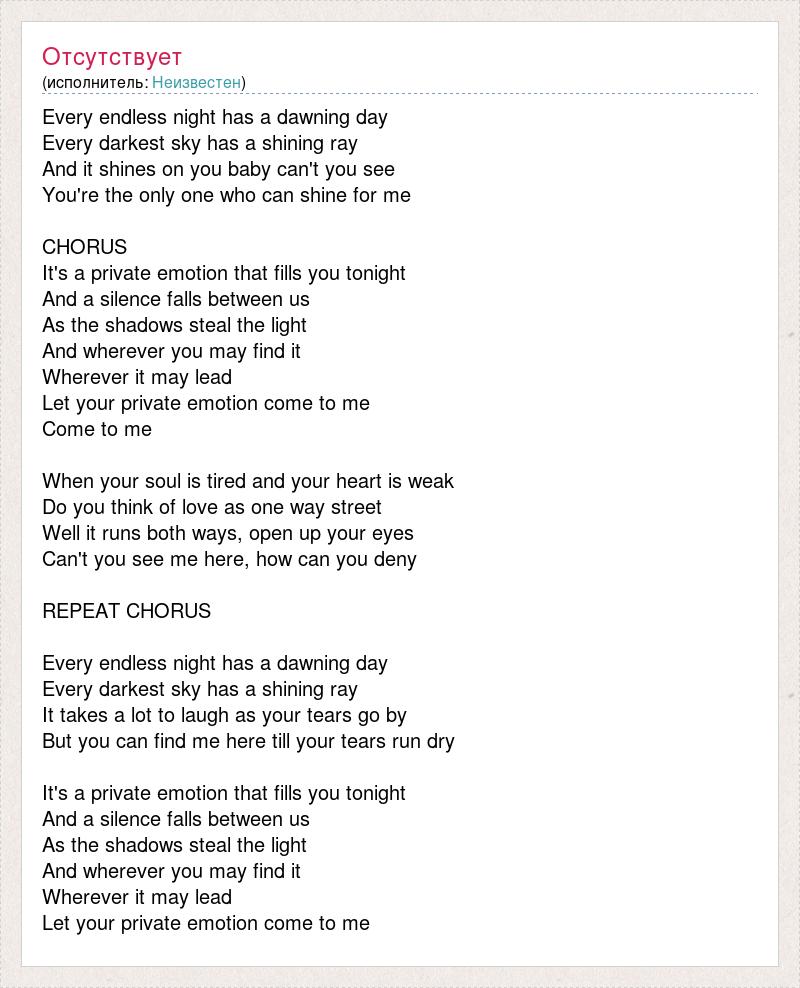 Every endless night has a dawning day Every darkest sky has a shining ray And it shines on you baby can't you see You're the only one who can shine for me CHORUS It's a private emotion that fills you tonight And a silence falls between us As the shadows steal the light And wherever you may find it Wherever it may lead Let your private emotion come to me Come to me When your soul is tired and your heart is weak Do you think of love as one way street Well it runs both ways, open up your eyes Can't you see me here, how can you deny REPEAT CHORUS Every endless night has a dawning day Every darkest sky has a shining ray It takes a lot to laugh as your tears go by But you can find me here till your tears run dry It's a private emotion that fills you tonight And a silence falls between us As the shadows steal the light And wherever you may find it Wherever it may lead Let your private emotion come to me