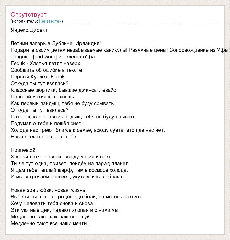 Яндекс.Директ Летний лагерь в Дублине, Ирландия! Подарите своим детям незабываемые каникулы! Разумные цены! Сопровождение из Уфы! eduguide [bad word] и телефонУфа Feduk - Хлопья летят наверх Сообщить об ошибке в тексте Первый Куплет: Feduk Откуда ты тут взялась? Классные шортики, бывшие джинсы Левайс Простой макияж, пахнешь Как первый ландыш, тебя не буду срывать. Откуда ты тут взялась? Пахнешь как первый ландыш, тебя не буду срывать. Подумал о тебе и пошёл снег. Холода нас греют ближе к семье, всюду суета, это где нас нет. Новые текста, но не о тебе. Припев:х2 Хлопья летят наверх, всюду магия и свет. Ты че тут одна, привет, пойдём на парад планет. Я дам тебе тёплый шарф, там в космосе холода. И мы встречаем рассвет, укутавшись в облака. Новая эра любви, новая жизнь. Выбери ты что - то родное до боли, но мы не знакомы. Хочу целовать тебя снова и снова. Эти уютные дни, падают хлопья и с ними мы. Медленно тают как наш поцелуй. Медленно тают все наши мечты.