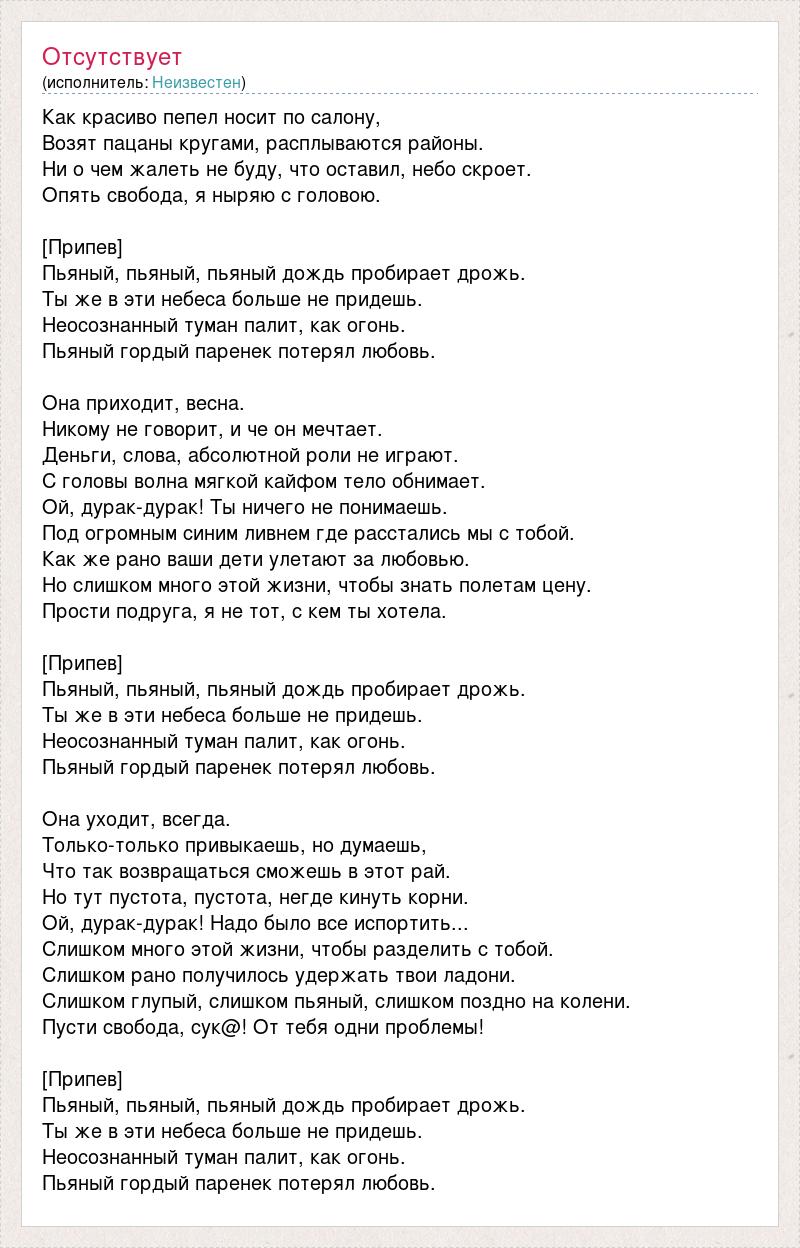 Как красиво пепел носит по салону, Возят пацаны кругами, расплываются районы. Ни о чем жалеть не буду, что оставил, небо скроет. Опять свобода, я ныряю с головою. [Припев] Пьяный, пьяный, пьяный дождь пробирает дрожь. Ты же в эти небеса больше не придешь. Неосознанный туман палит, как огонь. Пьяный гордый паренек потерял любовь. Она приходит, весна. Никому не говорит, и че он мечтает. Деньги, слова, абсолютной роли не играют. С головы волна мягкой кайфом тело обнимает. Ой, дурак-дурак! Ты ничего не понимаешь. Под огромным синим ливнем где расстались мы с тобой. Как же рано ваши дети улетают за любовью. Но слишком много этой жизни, чтобы знать полетам цену. Прости подруга, я не тот, с кем ты хотела. [Припев] Пьяный, пьяный, пьяный дождь пробирает дрожь. Ты же в эти небеса больше не придешь. Неосознанный туман палит, как огонь. Пьяный гордый паренек потерял любовь. Она уходит, всегда. Только-только привыкаешь, но думаешь, Что так возвращаться сможешь в этот рай. Но тут пустота, пустота, негде кинуть корни. Ой, дурак-дурак! Надо было все испортить... Слишком много этой жизни, чтобы разделить с тобой. Слишком рано получилось удержать твои ладони. Слишком глупый, слишком пьяный, слишком поздно на колени. Пусти свобода, сук@! От тебя одни проблемы! [Припев] Пьяный, пьяный, пьяный дождь пробирает дрожь. Ты же в эти небеса больше не придешь. Неосознанный туман палит, как огонь. Пьяный гордый паренек потерял любовь.