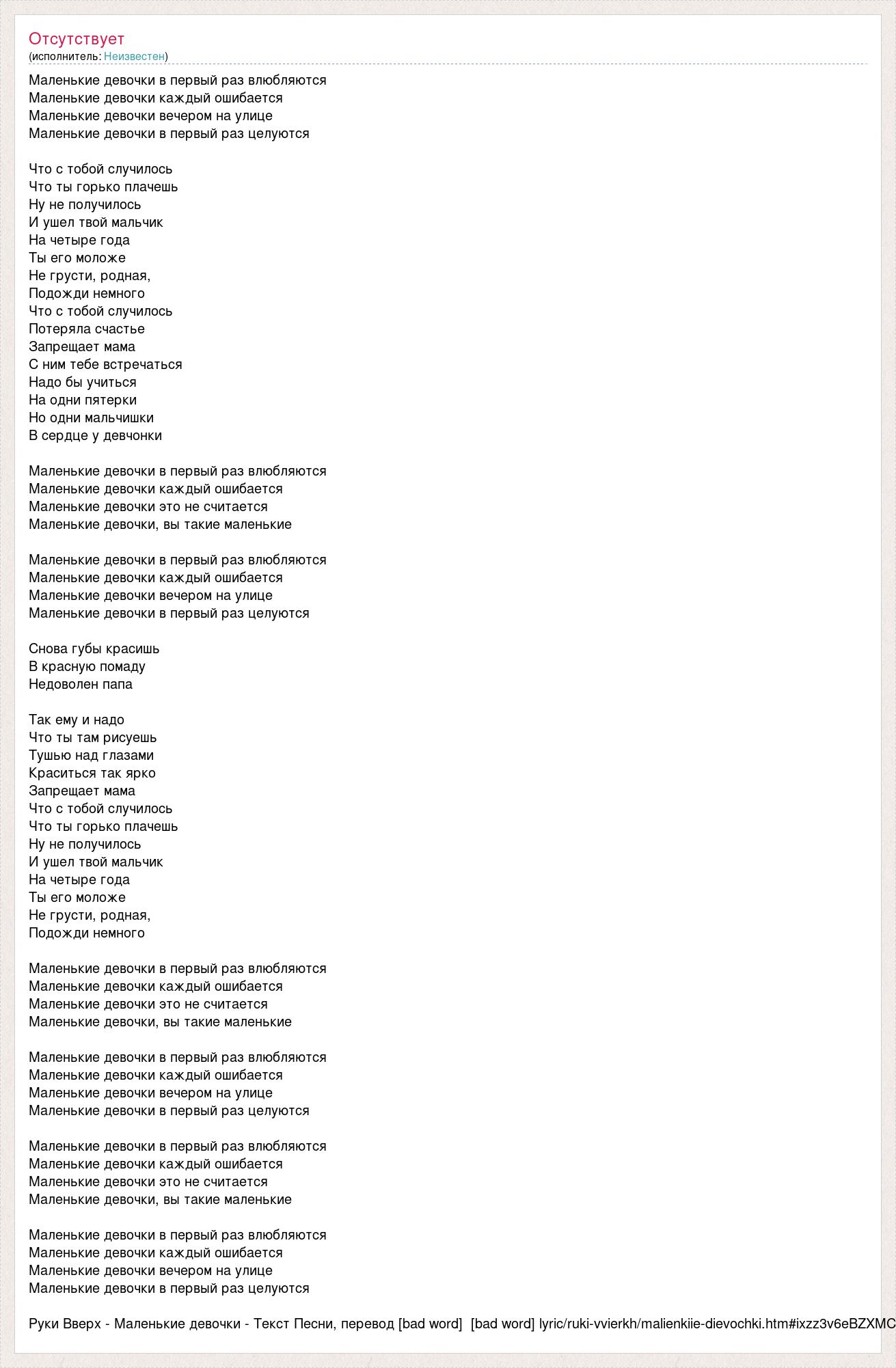 Маленькие девочки в первый раз влюбляются Маленькие девочки каждый ошибается Маленькие девочки вечером на улице Маленькие девочки в первый раз целуются Что с тобой случилось Что ты горько плачешь Ну не получилось И ушел твой мальчик На четыре года Ты его моложе Не грусти, родная, Подожди немного Что с тобой случилось Потеряла счастье Запрещает мама С ним тебе встречаться Надо бы учиться На одни пятерки Но одни мальчишки В сердце у девчонки Маленькие девочки в первый раз влюбляются Маленькие девочки каждый ошибается Маленькие девочки это не считается Маленькие девочки, вы такие маленькие Маленькие девочки в первый раз влюбляются Маленькие девочки каждый ошибается Маленькие девочки вечером на улице Маленькие девочки в первый раз целуются Снова губы красишь В красную помаду Недоволен папа Так ему и надо Что ты там рисуешь Тушью над глазами Краситься так ярко Запрещает мама Что с тобой случилось Что ты горько плачешь Ну не получилось И ушел твой мальчик На четыре года Ты его моложе Не грусти, родная, Подожди немного Маленькие девочки в первый раз влюбляются Маленькие девочки каждый ошибается Маленькие девочки это не считается Маленькие девочки, вы такие маленькие Маленькие девочки в первый раз влюбляются Маленькие девочки каждый ошибается Маленькие девочки вечером на улице Маленькие девочки в первый раз целуются Маленькие девочки в первый раз влюбляются Маленькие девочки каждый ошибается Маленькие девочки это не считается Маленькие девочки, вы такие маленькие Маленькие девочки в первый раз влюбляются Маленькие девочки каждый ошибается Маленькие девочки вечером на улице Маленькие девочки в первый раз целуются Руки Вверх - Маленькие девочки - Текст Песни, перевод [bad word] [bad word] lyric/ruki-vvierkh/malienkiie-dievochki.htm#ixzz3v6eBZXMC
