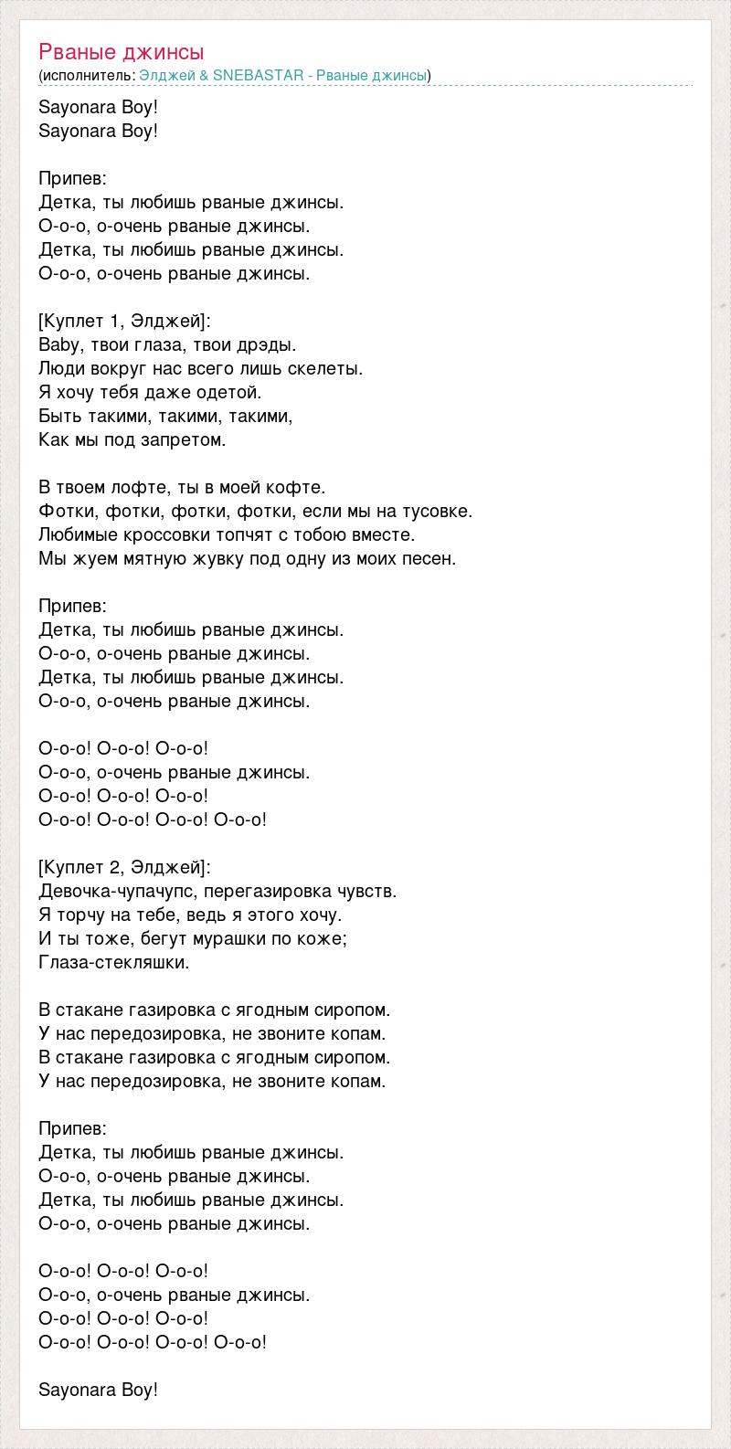 Sayonara Boy! Sayonara Boy! Припев: Детка, ты любишь рваные джинсы. О-о-о, о-очень рваные джинсы. Детка, ты любишь рваные джинсы. О-о-о, о-очень рваные джинсы. [Куплет 1, Элджей]: Baby, твои глаза, твои дрэды. Люди вокруг нас всего лишь скелеты. Я хочу тебя даже одетой. Быть такими, такими, такими, Как мы под запретом. В твоем лофте, ты в моей кофте. Фотки, фотки, фотки, фотки, если мы на тусовке. Любимые кроссовки топчят с тобою вместе. Мы жуем мятную жувку под одну из моих песен. Припев: Детка, ты любишь рваные джинсы. О-о-о, о-очень рваные джинсы. Детка, ты любишь рваные джинсы. О-о-о, о-очень рваные джинсы. О-о-о! О-о-о! О-о-о! О-о-о, о-очень рваные джинсы. О-о-о! О-о-о! О-о-о! О-о-о! О-о-о! О-о-о! О-о-о! [Куплет 2, Элджей]: Девочка-чупачупс, перегазировка чувств. Я торчу на тебе, ведь я этого хочу. И ты тоже, бегут мурашки по коже; Глаза-стекляшки. В стакане газировка с ягодным сиропом. У нас передозировка, не звоните копам. В стакане газировка с ягодным сиропом. У нас передозировка, не звоните копам. Припев: Детка, ты любишь рваные джинсы. О-о-о, о-очень рваные джинсы. Детка, ты любишь рваные джинсы. О-о-о, о-очень рваные джинсы. О-о-о! О-о-о! О-о-о! О-о-о, о-очень рваные джинсы. О-о-о! О-о-о! О-о-о! О-о-о! О-о-о! О-о-о! О-о-о! Sayonara Boy!