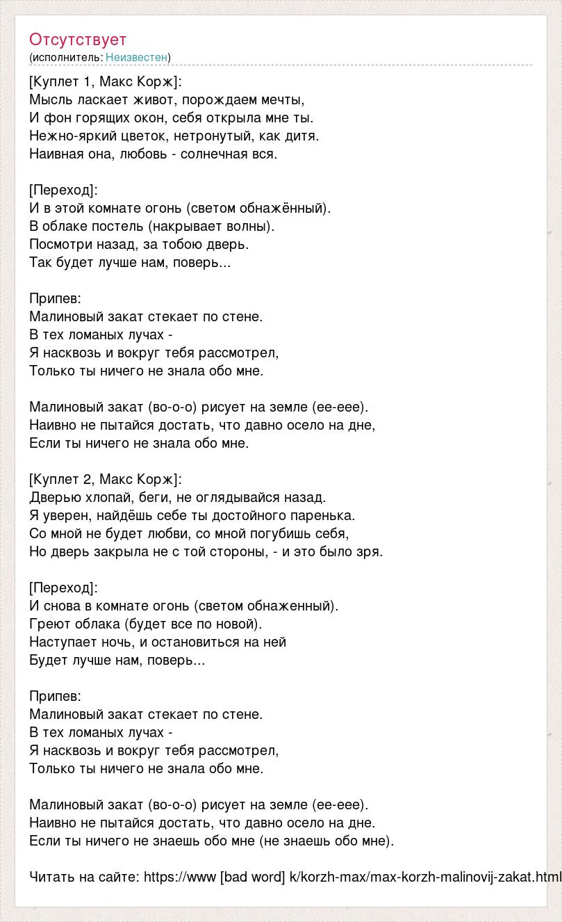 [Куплет 1, Макс Корж]: Мысль ласкает живот, порождаем мечты, И фон горящих окон, себя открыла мне ты. Нежно-яркий цветок, нетронутый, как дитя. Наивная она, любовь - солнечная вся. [Переход]: И в этой комнате огонь (светом обнажённый). В облаке постель (накрывает волны). Посмотри назад, за тобою дверь. Так будет лучше нам, поверь... Припев: Малиновый закат стекает по стене. В тех ломаных лучах - Я насквозь и вокруг тебя рассмотрел, Только ты ничего не знала обо мне. Малиновый закат (во-о-о) рисует на земле (ее-еее). Наивно не пытайся достать, что давно осело на дне, Если ты ничего не знала обо мне. [Куплет 2, Макс Корж]: Дверью хлопай, беги, не оглядывайся назад. Я уверен, найдёшь себе ты достойного паренька. Со мной не будет любви, со мной погубишь себя, Но дверь закрыла не с той стороны, - и это было зря. [Переход]: И снова в комнате огонь (светом обнаженный). Греют облака (будет все по новой). Наступает ночь, и остановиться на ней Будет лучше нам, поверь... Припев: Малиновый закат стекает по стене. В тех ломаных лучах - Я насквозь и вокруг тебя рассмотрел, Только ты ничего не знала обо мне. Малиновый закат (во-о-о) рисует на земле (ее-еее). Наивно не пытайся достать, что давно осело на дне. Если ты ничего не знаешь обо мне (не знаешь обо мне). Читать на сайте: https://www [bad word] k/korzh-max/max-korzh-malinovij-zakat.html