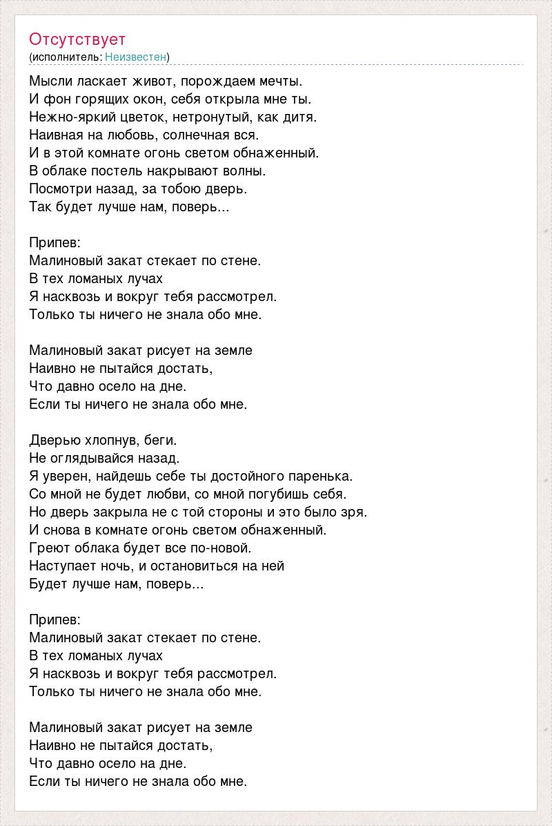 Мысли ласкает живот, порождаем мечты. И фон горящих окон, себя открыла мне ты. Нежно-яркий цветок, нетронутый, как дитя. Наивная на любовь, солнечная вся. И в этой комнате огонь светом обнаженный. В облаке постель накрывают волны. Посмотри назад, за тобою дверь. Так будет лучше нам, поверь... Припев: Малиновый закат стекает по стене. В тех ломаных лучах Я насквозь и вокруг тебя рассмотрел. Только ты ничего не знала обо мне. Малиновый закат рисует на земле Наивно не пытайся достать, Что давно осело на дне. Если ты ничего не знала обо мне. Дверью хлопнув, беги. Не оглядывайся назад. Я уверен, найдешь себе ты достойного паренька. Со мной не будет любви, со мной погубишь себя. Но дверь закрыла не с той стороны и это было зря. И снова в комнате огонь светом обнаженный. Греют облака будет все по-новой. Наступает ночь, и остановиться на ней Будет лучше нам, поверь... Припев: Малиновый закат стекает по стене. В тех ломаных лучах Я насквозь и вокруг тебя рассмотрел. Только ты ничего не знала обо мне. Малиновый закат рисует на земле Наивно не пытайся достать, Что давно осело на дне. Если ты ничего не знала обо мне.