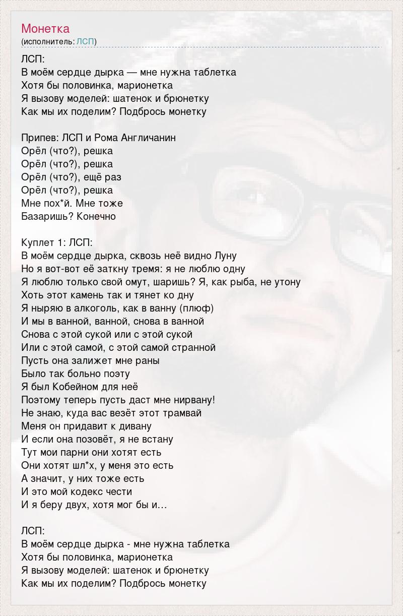 ЛСП: В моём сердце дырка — мне нужна таблетка Хотя бы половинка, марионетка Я вызову моделей: шатенок и брюнетку Как мы их поделим? Подбрось монетку Припев: ЛСП и Рома Англичанин Орёл (что?), решка Орёл (что?), решка Орёл (что?), ещё раз Орёл (что?), решка Мне пох*й. Мне тоже Базаришь? Конечно Куплет 1: ЛСП: В моём сердце дырка, сквозь неё видно Луну Но я вот-вот её заткну тремя: я не люблю одну Я люблю только свой омут, шаришь? Я, как рыба, не утону Хоть этот камень так и тянет ко дну Я ныряю в алкоголь, как в ванну (плюф) И мы в ванной, ванной, снова в ванной Снова с этой сукой или с этой сукой Или с этой самой, с этой самой странной Пусть она залижет мне раны Было так больно поэту Я был Кобейном для неё Поэтому теперь пусть даст мне нирвану! Не знаю, куда вас везёт этот трамвай Меня он придавит к дивану И если она позовёт, я не встану Тут мои парни они хотят есть Они хотят шл*х, у меня это есть А значит, у них тоже есть И это мой кодекс чести И я беру двух, хотя мог бы и… ЛСП: В моём сердце дырка - мне нужна таблетка Хотя бы половинка, марионетка Я вызову моделей: шатенок и брюнетку Как мы их поделим? Подбрось монетку