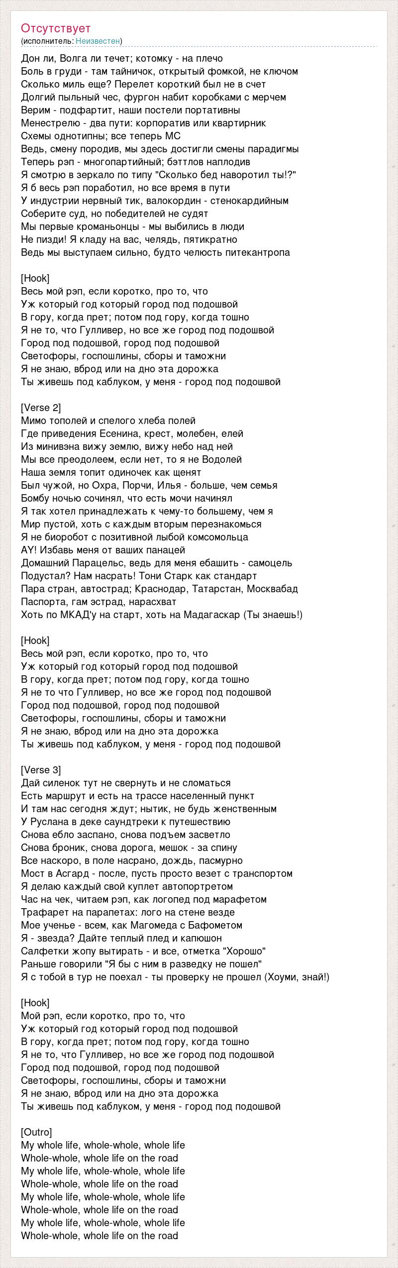 Дон ли, Волга ли течет; котомку - на плечо Боль в груди - там тайничок, открытый фомкой, не ключом Сколько миль еще? Перелет короткий был не в счет Долгий пыльный чес, фургон набит коробками с мерчем Верим - подфартит, наши постели портативны Менестрелю - два пути: корпоратив или квартирник Схемы однотипны; все теперь MC Ведь, смену породив, мы здесь достигли смены парадигмы Теперь рэп - многопартийный; бэттлов наплодив Я смотрю в зеркало по типу "Сколько бед наворотил ты!?" Я б весь рэп поработил, но все время в пути У индустрии нервный тик, валокордин - стенокардийным Соберите суд, но победителей не судят Мы первые кроманьонцы - мы выбились в люди Не пизди! Я кладу на вас, челядь, пятикратно Ведь мы выступаем сильно, будто челюсть питекантропа [Hook] Весь мой рэп, если коротко, про то, что Уж который год который город под подошвой В гору, когда прет; потом под гору, когда тошно Я не то, что Гулливер, но все же город под подошвой Город под подошвой, город под подошвой Светофоры, госпошлины, сборы и таможни Я не знаю, вброд или на дно эта дорожка Ты живешь под каблуком, у меня - город под подошвой [Verse 2] Мимо тополей и спелого хлеба полей Где приведения Есенина, крест, молебен, елей Из минивэна вижу землю, вижу небо над ней Мы все преодолеем, если нет, то я не Водолей Наша земля топит одиночек как щенят Был чужой, но Охра, Порчи, Илья - больше, чем семья Бомбу ночью сочинял, что есть мочи начинял Я так хотел принадлежать к чему-то большему, чем я Мир пустой, хоть с каждым вторым перезнакомься Я не биоробот с позитивной лыбой комсомольца AY! Избавь меня от ваших панацей Домашний Парацельс, ведь для меня ебашить - самоцель Подустал? Нам насрать! Тони Старк как стандарт Пара стран, автострад; Краснодар, Татарстан, Москвабад Паспорта, гам эстрад, нарасхват Хоть по МКАД'у на старт, хоть на Мадагаскар (Ты знаешь!) [Hook] Весь мой рэп, если коротко, про то, что Уж который год который город под подошвой В гору, когда прет; потом под гору, когда тошно Я не то что Гулливер, но все же город под подошвой Город под подошвой, город под подошвой Светофоры, госпошлины, сборы и таможни Я не знаю, вброд или на дно эта дорожка Ты живешь под каблуком, у меня - город под подошвой [Verse 3] Дай силенок тут не свернуть и не сломаться Есть маршрут и есть на трассе населенный пункт И там нас сегодня ждут; нытик, не будь женственным У Руслана в деке саундтреки к путешествию Снова ебло заспано, снова подъем засветло Снова броник, снова дорога, мешок - за спину Все наскоро, в поле насрано, дождь, пасмурно Мост в Асгард - после, пусть просто везет с транспортом Я делаю каждый свой куплет автопортретом Час на чек, читаем рэп, как логопед под марафетом Трафарет на парапетах: лого на стене везде Мое ученье - всем, как Магомеда с Бафометом Я - звезда? Дайте теплый плед и капюшон Салфетки жопу вытирать - и все, отметка "Хорошо" Раньше говорили "Я бы с ним в разведку не пошел" Я с тобой в тур не поехал - ты проверку не прошел (Хоуми, знай!) [Hook] Мой рэп, если коротко, про то, что Уж который год который город под подошвой В гору, когда прет; потом под гору, когда тошно Я не то, что Гулливер, но все же город под подошвой Город под подошвой, город под подошвой Светофоры, госпошлины, сборы и таможни Я не знаю, вброд или на дно эта дорожка Ты живешь под каблуком, у меня - город под подошвой [Outro] My whole life, whole-whole, whole life Whole-whole, whole life on the road My whole life, whole-whole