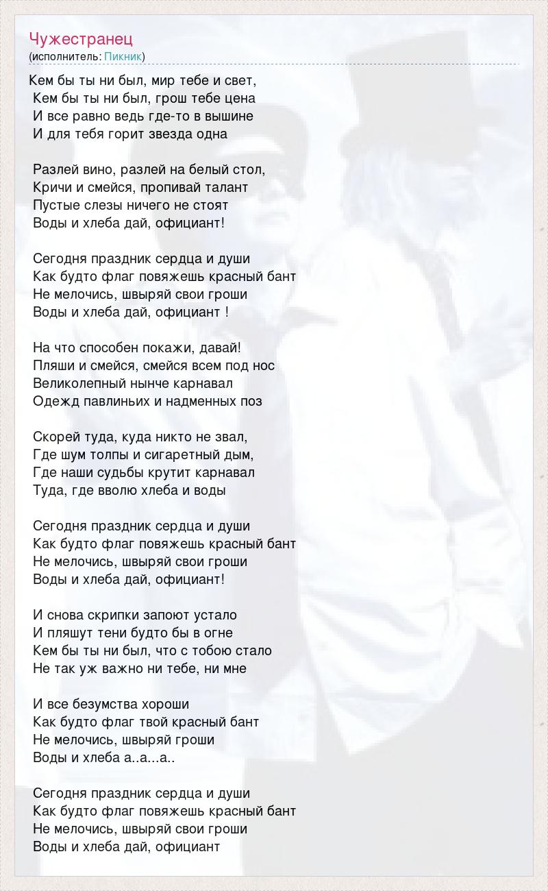 Кем бы ты ни был, мир тебе и свет, Кем бы ты ни был, грош тебе цена И все равно ведь где-то в вышине И для тебя горит звезда одна Разлей вино, разлей на белый стол, Кричи и смейся, пропивай талант Пустые слезы ничего не стоят Воды и хлеба дай, официант! Сегодня праздник сердца и души Как будто флаг повяжешь красный бант Не мелочись, швыряй свои гроши Воды и хлеба дай, официант ! На что способен покажи, давай! Пляши и смейся, смейся всем под нос Великолепный нынче карнавал Одежд павлиньих и надменных поз Скорей туда, куда никто не звал, Где шум толпы и сигаретный дым, Где наши судьбы крутит карнавал Туда, где вволю хлеба и воды Сегодня праздник сердца и души Как будто флаг повяжешь красный бант Не мелочись, швыряй свои гроши Воды и хлеба дай, официант! И снова скрипки запоют устало И пляшут тени будто бы в огне Кем бы ты ни был, что с тобою стало Не так уж важно ни тебе, ни мне И все безумства хороши Как будто флаг твой красный бант Не мелочись, швыряй гроши Воды и хлеба а..а...а.. Сегодня праздник сердца и души Как будто флаг повяжешь красный бант Не мелочись, швыряй свои гроши Воды и хлеба дай, официант