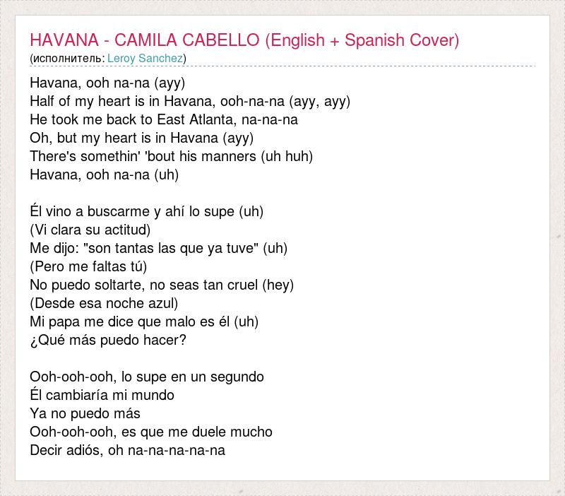 Havana, ooh na-na (ayy) Half of my heart is in Havana, ooh-na-na (ayy, ayy) He took me back to East Atlanta, na-na-na Oh, but my heart is in Havana (ayy) There's somethin' 'bout his manners (uh huh) Havana, ooh na-na (uh) Él vino a buscarme y ahí lo supe (uh) (Vi clara su actitud) Me dijo: "son tantas las que ya tuve" (uh) (Pero me faltas tú) No puedo soltarte, no seas tan cruel (hey) (Desde esa noche azul) Mi papa me dice que malo es él (uh) ¿Qué más puedo hacer? Ooh-ooh-ooh, lo supe en un segundo Él cambiaría mi mundo Ya no puedo más Ooh-ooh-ooh, es que me duele mucho Decir adiós, oh na-na-na-na-na