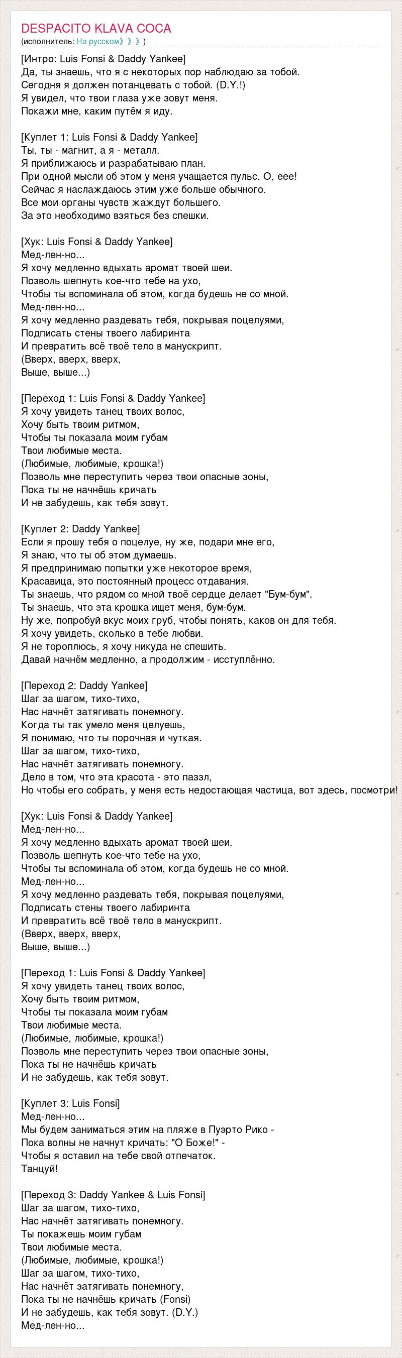[Интро: Luis Fonsi & Daddy Yankee] Да, ты знаешь, что я с некоторых пор наблюдаю за тобой. Сегодня я должен потанцевать с тобой. (D.Y.!) Я увидел, что твои глаза уже зовут меня. Покажи мне, каким путём я иду. [Куплет 1: Luis Fonsi & Daddy Yankee] Ты, ты - магнит, а я - металл. Я приближаюсь и разрабатываю план. При одной мысли об этом у меня учащается пульс. О, еее! Сейчас я наслаждаюсь этим уже больше обычного. Все мои органы чувств жаждут большего. За это необходимо взяться без спешки. [Хук: Luis Fonsi & Daddy Yankee] Мед-лен-но... Я хочу медленно вдыхать аромат твоей шеи. Позволь шепнуть кое-что тебе на ухо, Чтобы ты вспоминала об этом, когда будешь не со мной. Мед-лен-но... Я хочу медленно раздевать тебя, покрывая поцелуями, Подписать стены твоего лабиринта И превратить всё твоё тело в манускрипт. (Вверх, вверх, вверх, Выше, выше...) [Переход 1: Luis Fonsi & Daddy Yankee] Я хочу увидеть танец твоих волос, Хочу быть твоим ритмом, Чтобы ты показала моим губам Твои любимые места. (Любимые, любимые, крошка!) Позволь мне переступить через твои опасные зоны, Пока ты не начнёшь кричать И не забудешь, как тебя зовут. [Куплет 2: Daddy Yankee] Если я прошу тебя о поцелуе, ну же, подари мне его, Я знаю, что ты об этом думаешь. Я предпринимаю попытки уже некоторое время, Красавица, это постоянный процесс отдавания. Ты знаешь, что рядом со мной твоё сердце делает "Бум-бум". Ты знаешь, что эта крошка ищет меня, бум-бум. Ну же, попробуй вкус моих груб, чтобы понять, каков он для тебя. Я хочу увидеть, сколько в тебе любви. Я не тороплюсь, я хочу никуда не спешить. Давай начнём медленно, а продолжим - исступлённо. [Переход 2: Daddy Yankee] Шаг за шагом, тихо-тихо, Нас начнёт затягивать понемногу. Когда ты так умело меня целуешь, Я понимаю, что ты порочная и чуткая. Шаг за шагом, тихо-тихо, Нас начнёт затягивать понемногу. Дело в том, что эта красота - это паззл, Но чтобы его собрать, у меня есть недостающая частица, вот здесь, посмотри! [Хук: Luis Fonsi & Daddy Yankee] Мед-лен-но... Я хочу медленно вдыхать аромат твоей шеи. Позволь шепнуть кое-что тебе на ухо, Чтобы ты вспоминала об этом, когда будешь не со мной. Мед-лен-но... Я хочу медленно раздевать тебя, покрывая поцелуями, Подписать стены твоего лабиринта И превратить всё твоё тело в манускрипт. (Вверх, вверх, вверх, Выше, выше...) [Переход 1: Luis Fonsi & Daddy Yankee] Я хочу увидеть танец твоих волос, Хочу быть твоим ритмом, Чтобы ты показала моим губам Твои любимые места. (Любимые, любимые, крошка!) Позволь мне переступить через твои опасные зоны, Пока ты не начнёшь кричать И не забудешь, как тебя зовут. [Куплет 3: Luis Fonsi] Мед-лен-но... Мы будем заниматься этим на пляже в Пуэрто Рико - Пока волны не начнут кричать: "О Боже!" - Чтобы я оставил на тебе свой отпечаток. Танцуй! [Переход 3: Daddy Yankee & Luis Fonsi] Шаг за шагом, тихо-тихо, Нас начнёт затягивать понемногу. Ты покажешь моим губам Твои любимые места. (Любимые, любимые, крошка!) Шаг за шагом, тихо-тихо, Нас начнёт затягивать понемногу, Пока ты не начнёшь кричать (Fonsi) И не забудешь, как тебя зовут. (D.Y.) Мед-лен-но...
