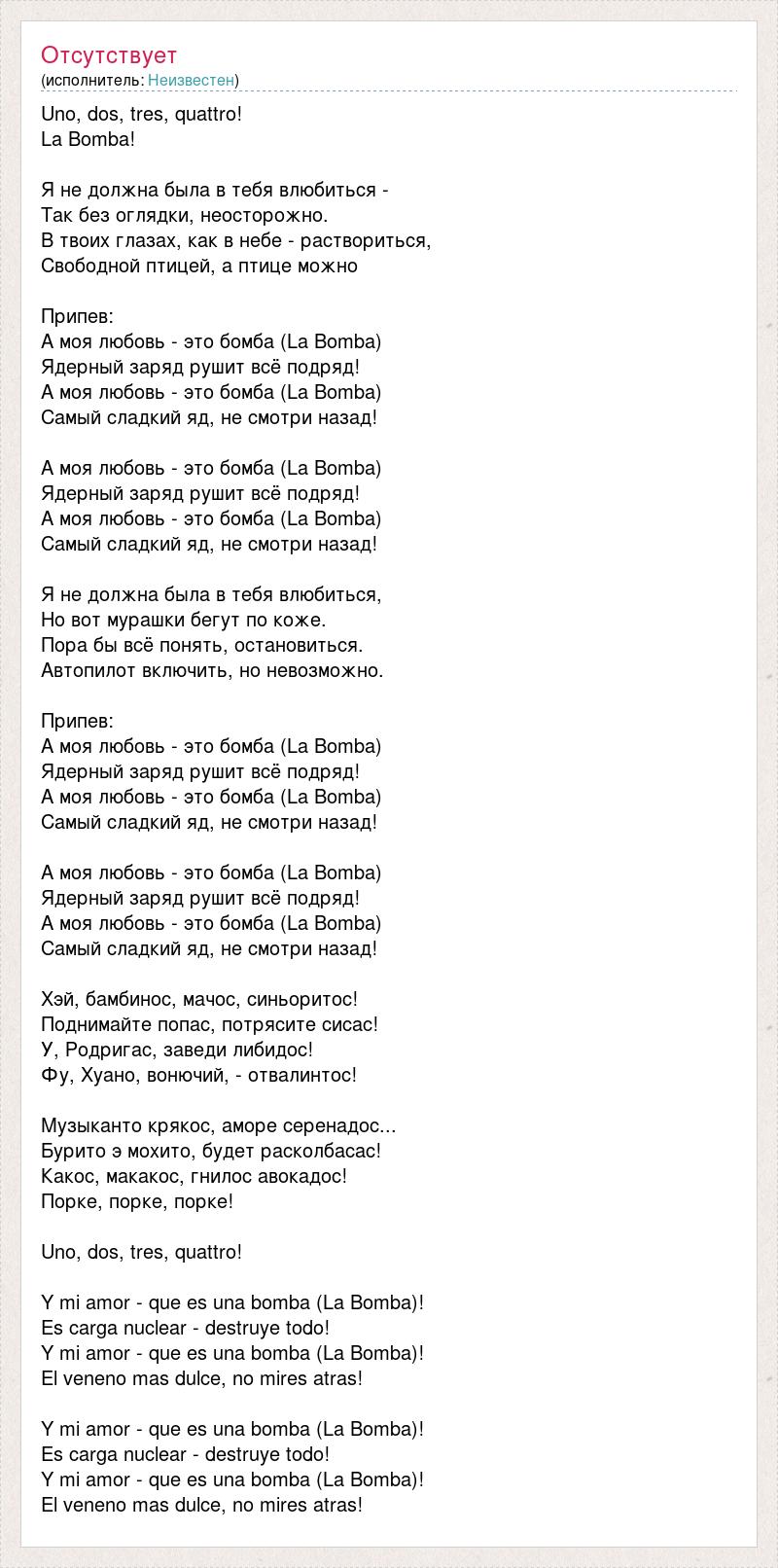 Uno, dos, tres, quattro! La Bomba! Я не должна была в тебя влюбиться - Так без оглядки, неосторожно. В твоих глазах, как в небе - раствориться, Свободной птицей, а птице можно Припев: А моя любовь - это бомба (La Bomba) Ядерный заряд рушит всё подряд! А моя любовь - это бомба (La Bomba) Самый сладкий яд, не смотри назад! А моя любовь - это бомба (La Bomba) Ядерный заряд рушит всё подряд! А моя любовь - это бомба (La Bomba) Самый сладкий яд, не смотри назад! Я не должна была в тебя влюбиться, Но вот мурашки бегут по коже. Пора бы всё понять, остановиться. Автопилот включить, но невозможно. Припев: А моя любовь - это бомба (La Bomba) Ядерный заряд рушит всё подряд! А моя любовь - это бомба (La Bomba) Самый сладкий яд, не смотри назад! А моя любовь - это бомба (La Bomba) Ядерный заряд рушит всё подряд! А моя любовь - это бомба (La Bomba) Самый сладкий яд, не смотри назад! Хэй, бамбинос, мачос, синьоритос! Поднимайте попас, потрясите сисас! У, Родригас, заведи либидос! Фу, Хуано, вонючий, - отвалинтос! Музыканто крякос, аморе серенадос... Бурито э мохито, будет расколбасас! Какос, макакос, гнилос авокадос! Порке, порке, порке! Uno, dos, tres, quattro! Y mi amor - que es una bomba (La Bomba)! Es carga nuclear - destruye todo! Y mi amor - que es una bomba (La Bomba)! El veneno mas dulce, no mires atras! Y mi amor - que es una bomba (La Bomba)! Es carga nuclear - destruye todo! Y mi amor - que es una bomba (La Bomba)! El veneno mas dulce, no mires atras!