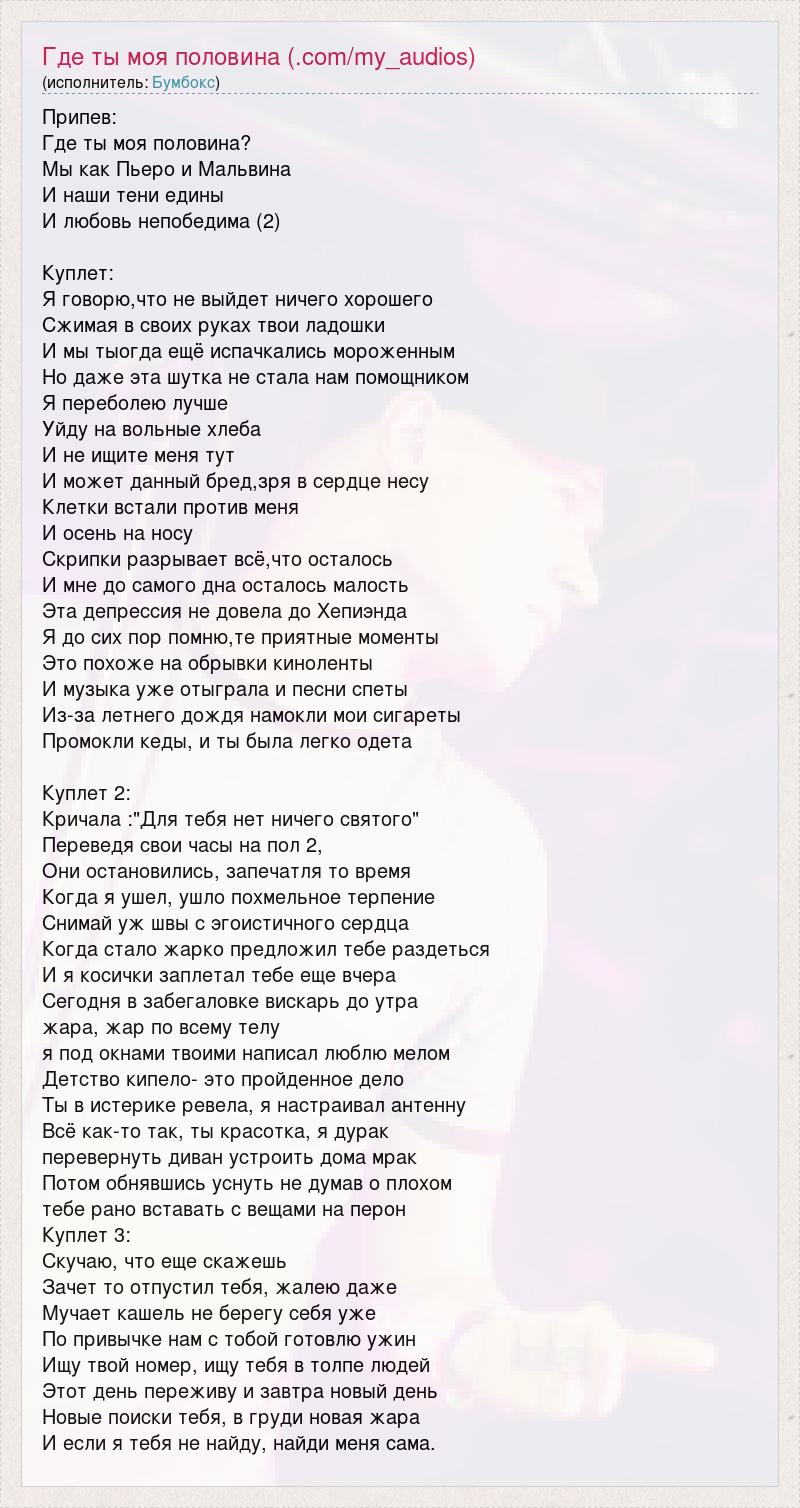 Припев: Где ты моя половина? Мы как Пьеро и Мальвина И наши тени едины И любовь непобедима (2) Куплет: Я говорю,что не выйдет ничего хорошего Сжимая в своих руках твои ладошки И мы тыогда ещё испачкались мороженным Но даже эта шутка не стала нам помощником Я переболею лучше Уйду на вольные хлеба И не ищите меня тут И может данный бред,зря в сердце несу Клетки встали против меня И осень на носу Скрипки разрывает всё,что осталось И мне до самого дна осталось малость Эта депрессия не довела до Хепиэнда Я до сих пор помню,те приятные моменты Это похоже на обрывки киноленты И музыка уже отыграла и песни спеты Из-за летнего дождя намокли мои сигареты Промокли кеды, и ты была легко одета Куплет 2: Кричала :"Для тебя нет ничего святого" Переведя свои часы на пол 2, Они остановились, запечатля то время Когда я ушел, ушло похмельное терпение Снимай уж швы с эгоистичного сердца Когда стало жарко предложил тебе раздеться И я косички заплетал тебе еще вчера Сегодня в забегаловке вискарь до утра жара, жар по всему телу я под окнами твоими написал люблю мелом Детство кипело- это пройденное дело Ты в истерике ревела, я настраивал антенну Всё как-то так, ты красотка, я дурак перевернуть диван устроить дома мрак Потом обнявшись уснуть не думав о плохом тебе рано вставать с вещами на перон Куплет 3: Скучаю, что еще скажешь Зачет то отпустил тебя, жалею даже Мучает кашель не берегу себя уже По привычке нам с тобой готовлю ужин Ищу твой номер, ищу тебя в толпе людей Этот день переживу и завтра новый день Новые поиски тебя, в груди новая жара И если я тебя не найду, найди меня сама.