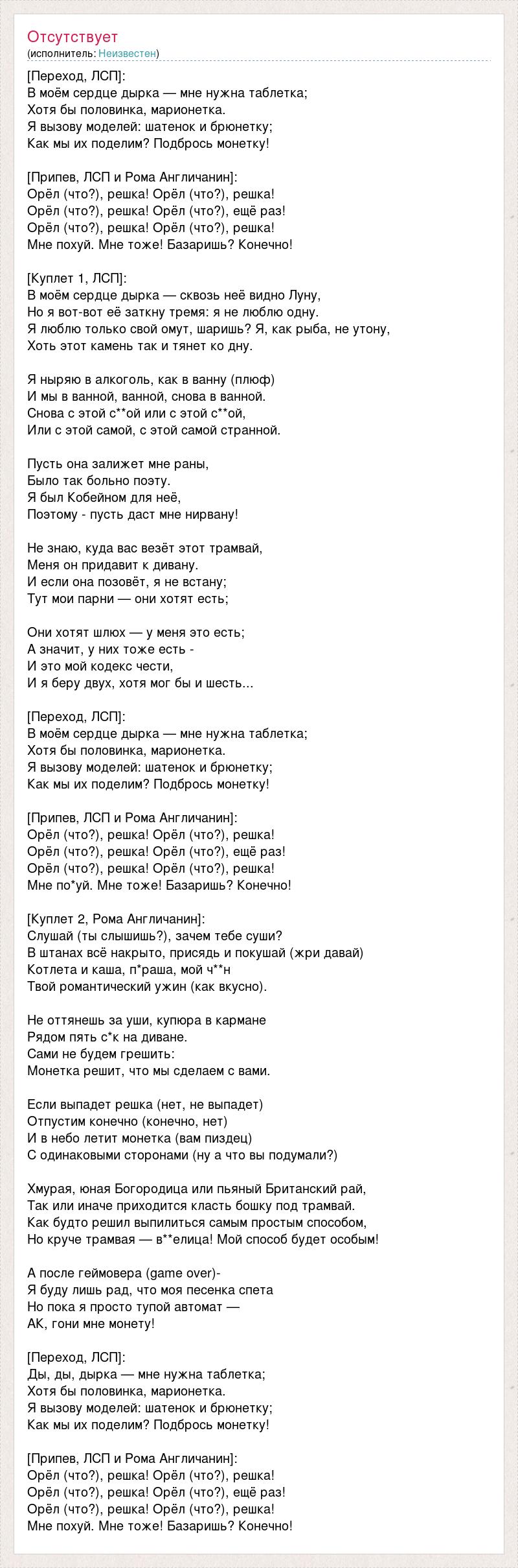 [Переход, ЛСП]: В моём сердце дырка — мне нужна таблетка; Хотя бы половинка, марионетка. Я вызову моделей: шатенок и брюнетку; Как мы их поделим? Подбрось монетку! [Припев, ЛСП и Рома Англичанин]: Орёл (что?), решка! Орёл (что?), решка! Орёл (что?), решка! Орёл (что?), ещё раз! Орёл (что?), решка! Орёл (что?), решка! Мне похуй. Мне тоже! Базаришь? Конечно! [Куплет 1, ЛСП]: В моём сердце дырка — сквозь неё видно Луну, Но я вот-вот её заткну тремя: я не люблю одну. Я люблю только свой омут, шаришь? Я, как рыба, не утону, Хоть этот камень так и тянет ко дну. Я ныряю в алкоголь, как в ванну (плюф) И мы в ванной, ванной, снова в ванной. Снова с этой с**ой или с этой с**ой, Или с этой самой, с этой самой странной. Пусть она залижет мне раны, Было так больно поэту. Я был Кобейном для неё, Поэтому - пусть даст мне нирвану! Не знаю, куда вас везёт этот трамвай, Меня он придавит к дивану. И если она позовёт, я не встану; Тут мои парни — они хотят есть; Они хотят шлюх — у меня это есть; А значит, у них тоже есть - И это мой кодекс чести, И я беру двух, хотя мог бы и шесть... [Переход, ЛСП]: В моём сердце дырка — мне нужна таблетка; Хотя бы половинка, марионетка. Я вызову моделей: шатенок и брюнетку; Как мы их поделим? Подбрось монетку! [Припев, ЛСП и Рома Англичанин]: Орёл (что?), решка! Орёл (что?), решка! Орёл (что?), решка! Орёл (что?), ещё раз! Орёл (что?), решка! Орёл (что?), решка! Мне по*уй. Мне тоже! Базаришь? Конечно! [Куплет 2, Рома Англичанин]: Слушай (ты слышишь?), зачем тебе суши? В штанах всё накрыто, присядь и покушай (жри давай) Котлета и каша, п*раша, мой ч**н Твой романтический ужин (как вкусно). Не оттянешь за уши, купюра в кармане Рядом пять с*к на диване. Сами не будем грешить: Монетка решит, что мы сделаем с вами. Если выпадет решка (нет, не выпадет) Отпустим конечно (конечно, нет) И в небо летит монетка (вам пиздец) С одинаковыми сторонами (ну а что вы подумали?) Хмурая, юная Богородица или пьяный Британский рай, Так или иначе приходится класть бошку под трамвай. Как будто решил выпилиться самым простым способом, Но круче трамвая — в**елица! Мой способ будет особым! А после геймовера (game over)- Я буду лишь рад, что моя песенка спета Но пока я просто тупой автомат — АК, гони мне монету! [Переход, ЛСП]: Ды, ды, дырка — мне нужна таблетка; Хотя бы половинка, марионетка. Я вызову моделей: шатенок и брюнетку; Как мы их поделим? Подбрось монетку! [Припев, ЛСП и Рома Англичанин]: Орёл (что?), решка! Орёл (что?), решка! Орёл (что?), решка! Орёл (что?), ещё раз! Орёл (что?), решка! Орёл (что?), решка! Мне похуй. Мне тоже! Базаришь? Конечно!