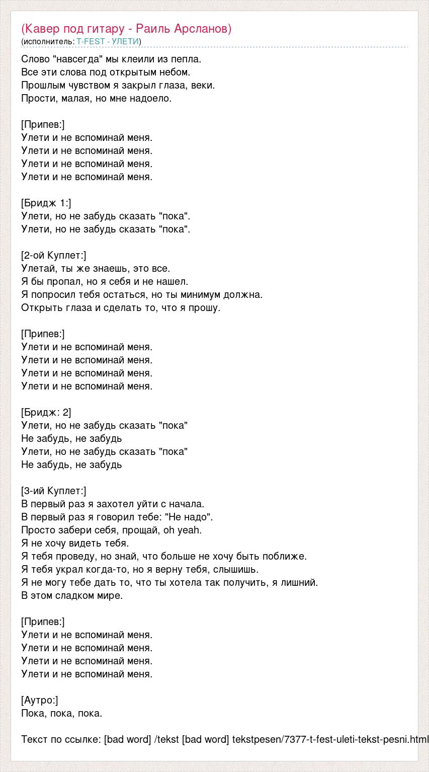 Слово "навсегда" мы клеили из пепла. Все эти слова под открытым небом. Прошлым чувством я закрыл глаза, веки. Прости, малая, но мне надоело. [Припев:] Улети и не вспоминай меня. Улети и не вспоминай меня. Улети и не вспоминай меня. Улети и не вспоминай меня. [Бридж 1:] Улети, но не забудь сказать "пока". Улети, но не забудь сказать "пока". [2-ой Куплет:] Улетай, ты же знаешь, это все. Я бы пропал, но я себя и не нашел. Я попросил тебя остаться, но ты минимум должна. Открыть глаза и сделать то, что я прошу. [Припев:] Улети и не вспоминай меня. Улети и не вспоминай меня. Улети и не вспоминай меня. Улети и не вспоминай меня. [Бридж: 2] Улети, но не забудь сказать "пока" Не забудь, не забудь Улети, но не забудь сказать "пока" Не забудь, не забудь [3-ий Куплет:] В первый раз я захотел уйти с начала. В первый раз я говорил тебе: "Не надо". Просто забери себя, прощай, oh yeah. Я не хочу видеть тебя. Я тебя проведу, но знай, что больше не хочу быть поближе. Я тебя украл когда-то, но я верну тебя, слышишь. Я не могу тебе дать то, что ты хотела так получить, я лишний. В этом сладком мире. [Припев:] Улети и не вспоминай меня. Улети и не вспоминай меня. Улети и не вспоминай меня. Улети и не вспоминай меня. [Аутро:] Пока, пока, пока. Текст по ссылке: [bad word] /tekst [bad word] tekstpesen/7377-t-fest-uleti-tekst-pesni.html