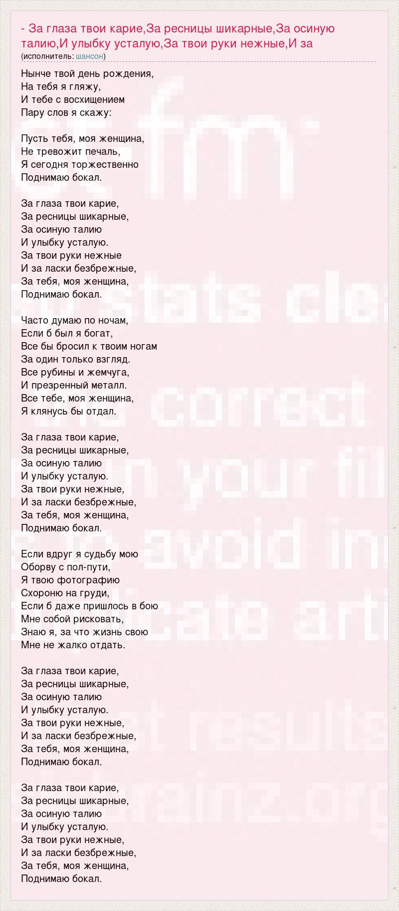 Нынче твой день рождения, На тебя я гляжу, И тебе с восхищением Пару слов я скажу: Пусть тебя, моя женщина, Не тревожит печаль, Я сегодня торжественно Поднимаю бокал. За глаза твои карие, За ресницы шикарные, За осиную талию И улыбку усталую. За твои руки нежные И за ласки безбрежные, За тебя, моя женщина, Поднимаю бокал. Часто думаю по ночам, Если б был я богат, Все бы бросил к твоим ногам За один только взгляд. Все рубины и жемчуга, И презренный металл. Все тебе, моя женщина, Я клянусь бы отдал. За глаза твои карие, За ресницы шикарные, За осиную талию И улыбку усталую. За твои руки нежные, И за ласки безбрежные, За тебя, моя женщина, Поднимаю бокал. Если вдруг я судьбу мою Оборву с пол-пути, Я твою фотографию Схороню на груди, Если б даже пришлось в бою Мне собой рисковать, Знаю я, за что жизнь свою Мне не жалко отдать. За глаза твои карие, За ресницы шикарные, За осиную талию И улыбку усталую. За твои руки нежные, И за ласки безбрежные, За тебя, моя женщина, Поднимаю бокал. За глаза твои карие, За ресницы шикарные, За осиную талию И улыбку усталую. За твои руки нежные, И за ласки безбрежные, За тебя, моя женщина, Поднимаю бокал.