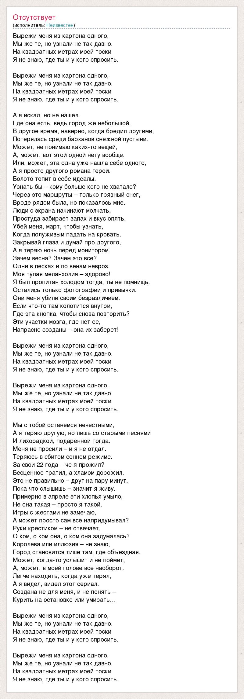 Вырежи меня из картона одного, Мы же те, но узнали не так давно. На квадратных метрах моей тоски Я не знаю, где ты и у кого спросить. Вырежи меня из картона одного, Мы же те, но узнали не так давно. На квадратных метрах моей тоски Я не знаю, где ты и у кого спросить. А я искал, но не нашел. Где она есть, ведь город же небольшой. В другое время, наверно, когда бредил другими, Потерялась среди барханов снежной пустыни. Может, не понимаю каких-то вещей, А, может, вот этой одной нету вообще. Или, может, эта одна уже нашла себе одного, А я просто другого романа герой. Болото топит в себе идеалы. Узнать бы – кому больше кого не хватало? Через это маршруты – только грязный снег, Вроде рядом была, но показалось мне. Люди с экрана начинают молчать, Простуда забирает запах и вкус опять. Убей меня, март, чтобы узнать, Когда полуживым падать на кровать. Закрывай глаза и думай про другого, А я теряю ночь перед монитором. Зачем весна? Зачем это все? Одни в песках и по венам невроз. Моя тупая меланхолия – здорово! Я был пропитан холодом тогда, ты не помнищь. Остались только фотографии и привычки. Они меня убили своим безразличием. Если что-то там колотится внутри, Где эта кнопка, чтобы снова повторить? Эти участки мозга, где нет ее, Напрасно созданы – она их заберет! Вырежи меня из картона одного, Мы же те, но узнали не так давно. На квадратных метрах моей тоски Я не знаю, где ты и у кого спросить. Вырежи меня из картона одного, Мы же те, но узнали не так давно. На квадратных метрах моей тоски Я не знаю, где ты и у кого спросить. Мы с тобой останемся нечестными, А я теряю другую, но лишь со старыми песнями И лихорадкой, подаренной тогда. Меня не просили – и я не отдал. Теряюсь в сбитом сонном режиме. За свои 22 года – че я прожил? Бесценное тратил, а хламом дорожил. Это не правильно – друг на пару минут, Пока что слышишь – значит я живу. Примерно в апреле эти хлопья умыло, Не она такая – просто я такой. Игры с жестами не замечаю, А может просто сам все напридумывал? Руки крестиком – не отвечает, О ком, о ком она, о ком она задумалась? Королева или иллюзия – не знаю, Город становится тише там, где объездная. Может, когда-то услышит и не поймет, А, может, в моей голове все наоборот. Легче находить, когда уже терял, А я видел, видел этот сериал. Создана не для меня, и не понять – Курить на остановке или умирать… Вырежи меня из картона одного, Мы же те, но узнали не так давно. На квадратных метрах моей тоски Я не знаю, где ты и у кого спросить. Вырежи меня из картона одного, Мы же те, но узнали не так давно. На квадратных метрах моей тоски Я не знаю, где ты и у кого спросить.
