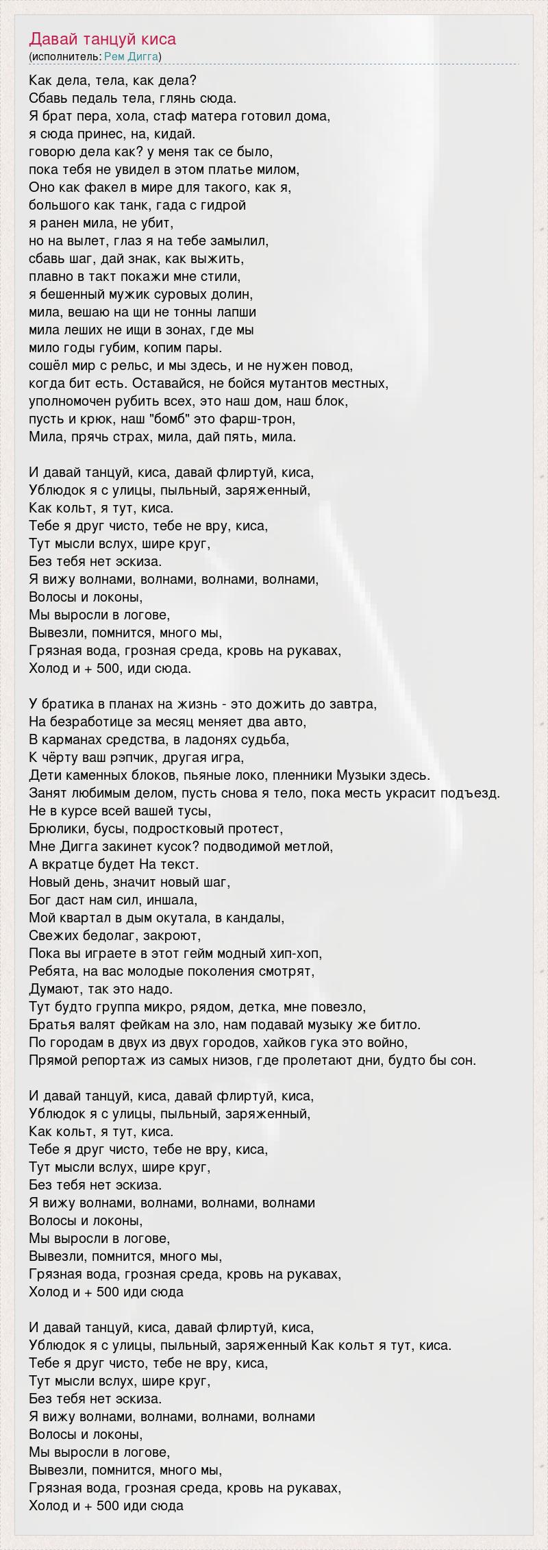 Как дела, тела, как дела? Сбавь педаль тела, глянь сюда. Я брат пера, хола, стаф матера готовил дома, я сюда принес, на, кидай. говорю дела как? у меня так се было, пока тебя не увидел в этом платье милом, Оно как факел в мире для такого, как я, большого как танк, гада с гидрой я ранен мила, не убит, но на вылет, глаз я на тебе замылил, сбавь шаг, дай знак, как выжить, плавно в такт покажи мне стили, я бешенный мужик суровых долин, мила, вешаю на щи не тонны лапши мила леших не ищи в зонах, где мы мило годы губим, копим пары. сошёл мир с рельс, и мы здесь, и не нужен повод, когда бит есть. Оставайся, не бойся мутантов местных, уполномочен рубить всех, это наш дом, наш блок, пусть и крюк, наш "бомб" это фарш-трон, Мила, прячь страх, мила, дай пять, мила. И давай танцуй, киса, давай флиртуй, киса, Ублюдок я с улицы, пыльный, заряженный, Как кольт, я тут, киса. Тебе я друг чисто, тебе не вру, киса, Тут мысли вслух, шире круг, Без тебя нет эскиза. Я вижу волнами, волнами, волнами, волнами, Волосы и локоны, Мы выросли в логове, Вывезли, помнится, много мы, Грязная вода, грозная среда, кровь на рукавах, Холод и + 500, иди сюда. У братика в планах на жизнь - это дожить до завтра, На безработице за месяц меняет два авто, В карманах средства, в ладонях судьба, К чёрту ваш рэпчик, другая игра, Дети каменных блоков, пьяные локо, пленники Музыки здесь. Занят любимым делом, пусть снова я тело, пока месть украсит подъезд. Не в курсе всей вашей тусы, Брюлики, бусы, подростковый протест, Мне Дигга закинет кусок? подводимой метлой, А вкратце будет На текст. Новый день, значит новый шаг, Бог даст нам сил, иншала, Мой квартал в дым окутала, в кандалы, Свежих бедолаг, закроют, Пока вы играете в этот гейм модный хип-хоп, Ребята, на вас молодые поколения смотрят, Думают, так это надо. Тут будто группа микро, рядом, детка, мне повезло, Братья валят фейкам на зло, нам подавай музыку же битло. По городам в двух из двух городов, хайков гука это войно, Прямой репортаж из самых низов, где пролетают дни, будто бы сон. И давай танцуй, киса, давай флиртуй, киса, Ублюдок я с улицы, пыльный, заряженный, Как кольт, я тут, киса. Тебе я друг чисто, тебе не вру, киса, Тут мысли вслух, шире круг, Без тебя нет эскиза. Я вижу волнами, волнами, волнами, волнами Волосы и локоны, Мы выросли в логове, Вывезли, помнится, много мы, Грязная вода, грозная среда, кровь на рукавах, Холод и + 500 иди сюда И давай танцуй, киса, давай флиртуй, киса, Ублюдок я с улицы, пыльный, заряженный Как кольт я тут, киса. Тебе я друг чисто, тебе не вру, киса, Тут мысли вслух, шире круг, Без тебя нет эскиза. Я вижу волнами, волнами, волнами, волнами Волосы и локоны, Мы выросли в логове, Вывезли, помнится, много мы, Грязная вода, грозная среда, кровь на рукавах, Холод и + 500 иди сюда
