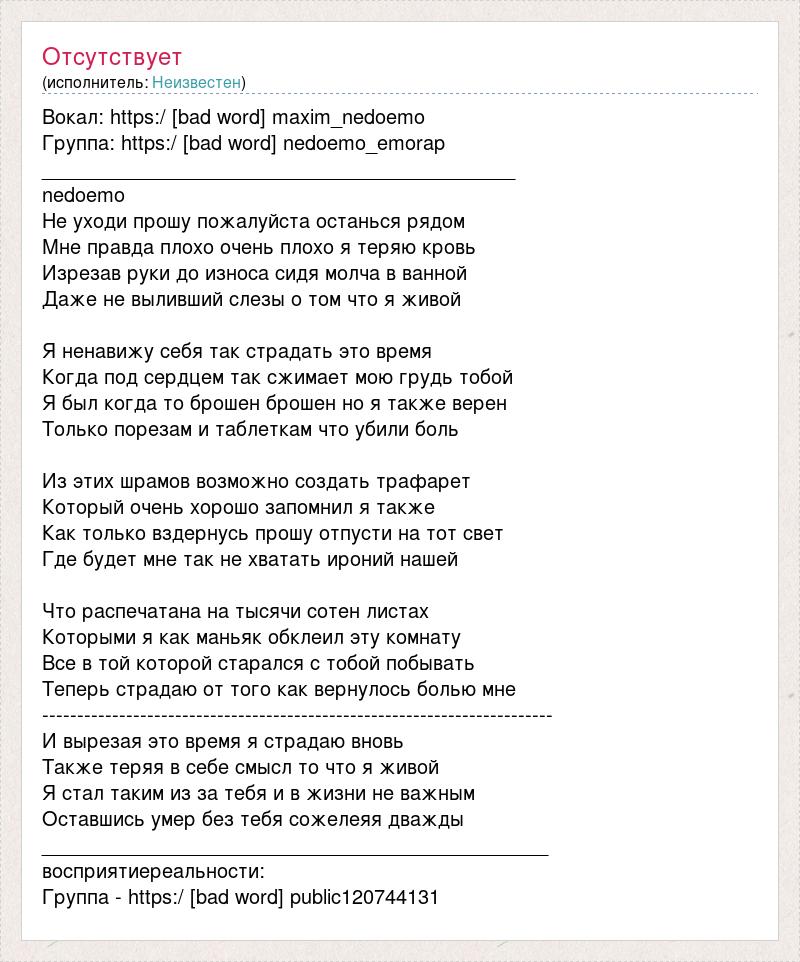 Вокал: https:/ [bad word] maxim_nedoemo Группа: https:/ [bad word] nedoemo_emorap ___________________________________________ nedoemo Не уходи прошу пожалуйста останься рядом Мне правда плохо очень плохо я теряю кровь Изрезав руки до износа сидя молча в ванной Даже не выливший слезы о том что я живой Я ненавижу себя так страдать это время Когда под сердцем так сжимает мою грудь тобой Я был когда то брошен брошен но я также верен Только порезам и таблеткам что убили боль Из этих шрамов возможно создать трафарет Который очень хорошо запомнил я также Как только вздернусь прошу отпусти на тот свет Где будет мне так не хватать ироний нашей Что распечатана на тысячи сотен листах Которыми я как маньяк обклеил эту комнату Все в той которой старался с тобой побывать Теперь страдаю от того как вернулось болью мне ------------------------------------------------------------------------- И вырезая это время я страдаю вновь Также теряя в себе смысл то что я живой Я стал таким из за тебя и в жизни не важным Оставшись умер без тебя сожелеяя дважды ______________________________________________ восприятиереальности: Группа - https:/ [bad word] public120744131