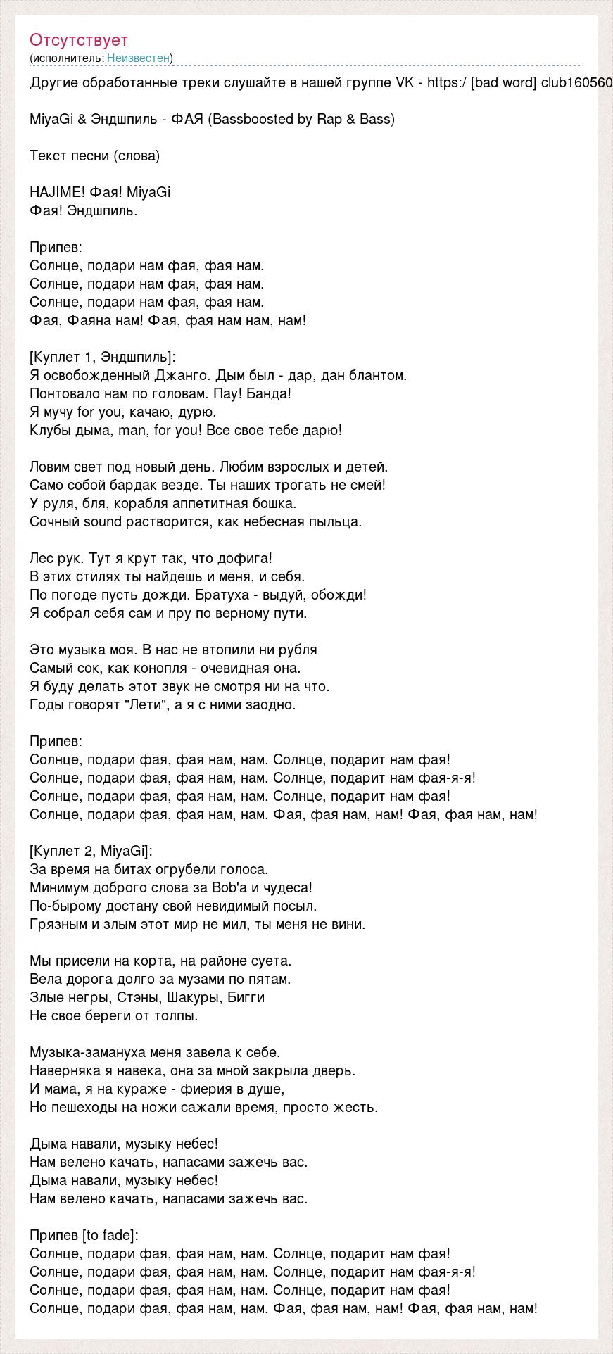 Другие обработанные треки слушайте в нашей группе VK - https:/ [bad word] club160560 MiyaGi & Эндшпиль - ФАЯ (Bassboosted by Rap & Bass) Текст песни (слова) HAJIME! Фая! MiyaGi Фая! Эндшпиль. Припев: Солнце, подари нам фая, фая нам. Солнце, подари нам фая, фая нам. Солнце, подари нам фая, фая нам. Фая, Фаяна нам! Фая, фая нам нам, нам! [Куплет 1, Эндшпиль]: Я освобожденный Джанго. Дым был - дар, дан блантом. Понтовало нам по головам. Пау! Банда! Я мучу for you, качаю, дурю. Клубы дыма, man, for you! Все свое тебе дарю! Ловим свет под новый день. Любим взрослых и детей. Само собой бардак везде. Ты наших трогать не смей! У руля, бля, корабля аппетитная бошка. Сочный sound растворится, как небесная пыльца. Лес рук. Тут я крут так, что дофига! В этих стилях ты найдешь и меня, и себя. По погоде пусть дожди. Братуха - выдуй, обожди! Я собрал себя сам и пру по верному пути. Это музыка моя. В нас не втопили ни рубля Самый сок, как конопля - очевидная она. Я буду делать этот звук не смотря ни на что. Годы говорят "Лети", а я с ними заодно. Припев: Солнце, подари фая, фая нам, нам. Солнце, подарит нам фая! Солнце, подари фая, фая нам, нам. Солнце, подарит нам фая-я-я! Солнце, подари фая, фая нам, нам. Солнце, подарит нам фая! Солнце, подари фая, фая нам, нам. Фая, фая нам, нам! Фая, фая нам, нам! [Куплет 2, MiyaGi]: За время на битах огрубели голоса. Минимум доброго слова за Bob'a и чудеса! По-бырому достану свой невидимый посыл. Грязным и злым этот мир не мил, ты меня не вини. Мы присели на корта, на районе суета. Вела дорога долго за музами по пятам. Злые негры, Стэны, Шакуры, Бигги Не свое береги от толпы. Музыка-замануха меня завела к себе. Наверняка я навека, она за мной закрыла дверь. И мама, я на кураже - фиерия в душе, Но пешеходы на ножи сажали время, просто жесть. Дыма навали, музыку небес! Нам велено качать, напасами зажечь вас. Дыма навали, музыку небес! Нам велено качать, напасами зажечь вас. Припев [to fade]: Солнце, подари фая, фая нам, нам. Солнце, подарит нам фая! Солнце, подари фая, фая нам, нам. Солнце, подарит нам фая-я-я! Солнце, подари фая, фая нам, нам. Солнце, подарит нам фая! Солнце, подари фая, фая нам, нам. Фая, фая нам, нам! Фая, фая нам, нам!