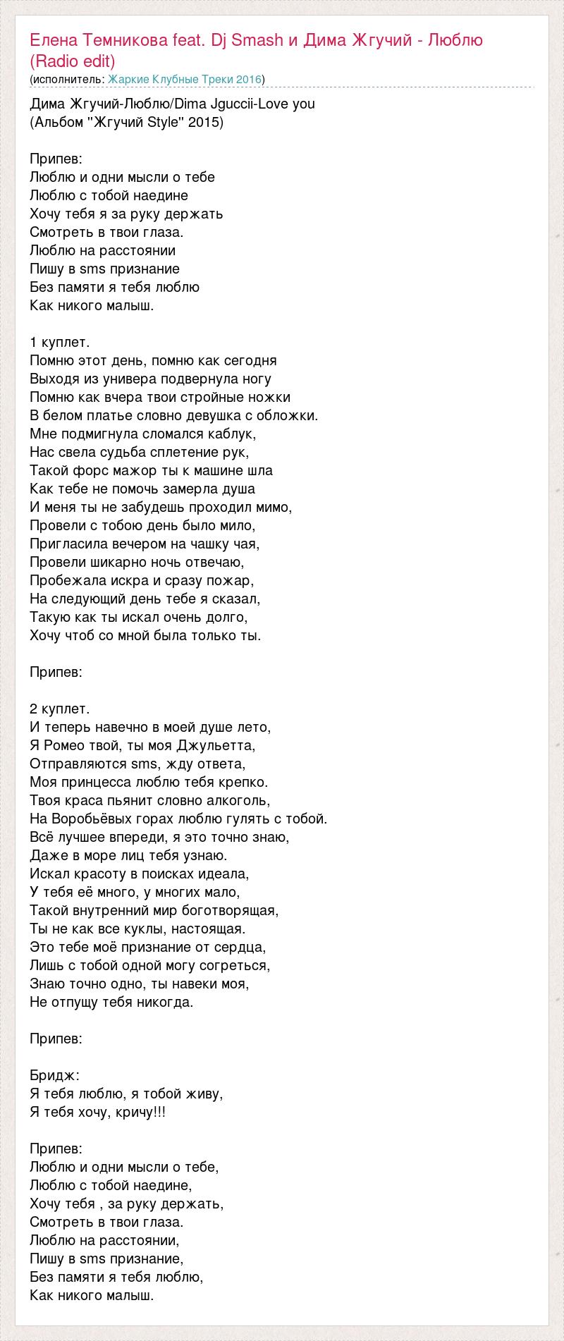 Дима Жгучий-Люблю/Dima Jguccii-Love you (Альбом ''Жгучий Style'' 2015) Припев: Люблю и одни мысли о тебе Люблю с тобой наедине Хочу тебя я за руку держать Смотреть в твои глаза. Люблю на расстоянии Пишу в sms признание Без памяти я тебя люблю Как никого малыш. 1 куплет. Помню этот день, помню как сегодня Выходя из универа подвернула ногу Помню как вчера твои стройные ножки В белом платье словно девушка с обложки. Мне подмигнула сломался каблук, Нас свела судьба сплетение рук, Такой форс мажор ты к машине шла Как тебе не помочь замерла душа И меня ты не забудешь проходил мимо, Провели с тобою день было мило, Пригласила вечером на чашку чая, Провели шикарно ночь отвечаю, Пробежала искра и сразу пожар, На следующий день тебе я сказал, Такую как ты искал очень долго, Хочу чтоб со мной была только ты. Припев: 2 куплет. И теперь навечно в моей душе лето, Я Ромео твой, ты моя Джульетта, Отправляются sms, жду ответа, Моя принцесса люблю тебя крепко. Твоя краса пьянит словно алкоголь, На Воробьёвых горах люблю гулять с тобой. Всё лучшее впереди, я это точно знаю, Даже в море лиц тебя узнаю. Искал красоту в поисках идеала, У тебя её много, у многих мало, Такой внутренний мир боготворящая, Ты не как все куклы, настоящая. Это тебе моё признание от сердца, Лишь с тобой одной могу согреться, Знаю точно одно, ты навеки моя, Не отпущу тебя никогда. Припев: Бридж: Я тебя люблю, я тобой живу, Я тебя хочу, кричу!!! Припев: Люблю и одни мысли о тебе, Люблю с тобой наедине, Хочу тебя , за руку держать, Смотреть в твои глаза. Люблю на расстоянии, Пишу в sms признание, Без памяти я тебя люблю, Как никого малыш.