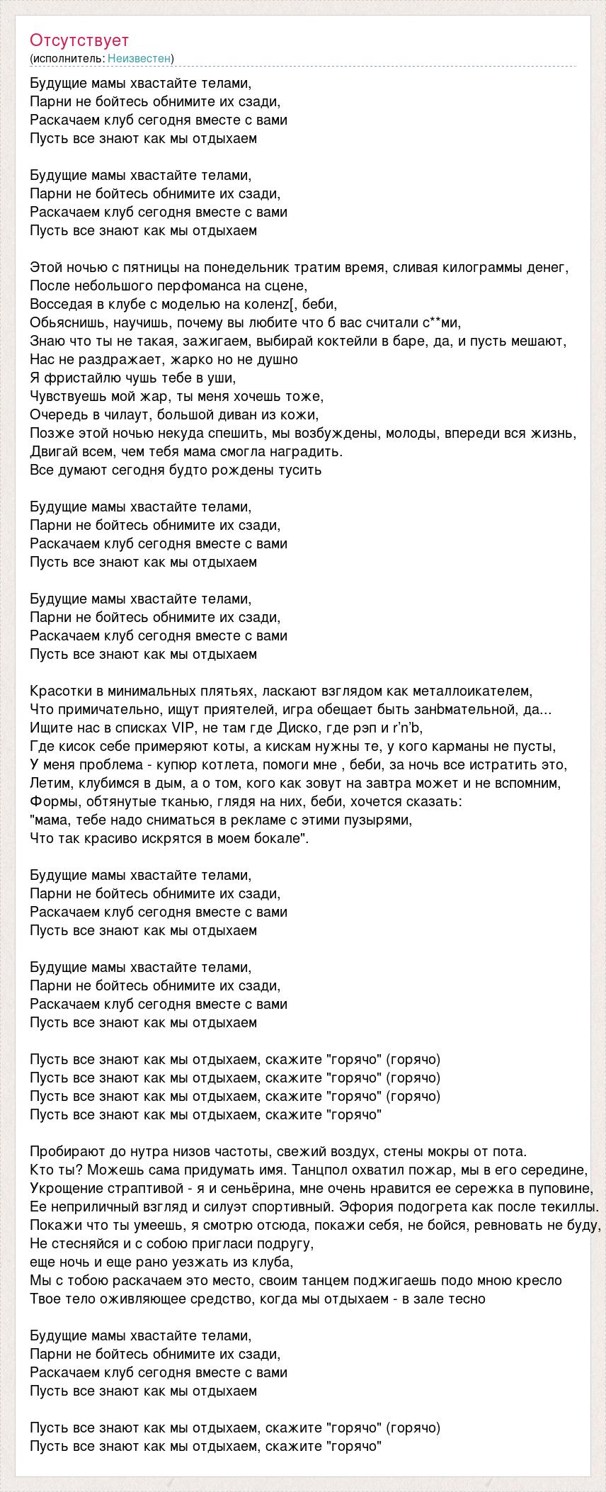 Будущие мамы хвастайте телами, Парни не бойтесь обнимите их сзади, Раскачаем клуб сегодня вместе с вами Пусть все знают как мы отдыхаем Будущие мамы хвастайте телами, Парни не бойтесь обнимите их сзади, Раскачаем клуб сегодня вместе с вами Пусть все знают как мы отдыхаем Этой ночью с пятницы на понедельник тратим время, сливая килограммы денег, После небольшого перфоманса на сцене, Восседая в клубе с моделью на коленz[, беби, Обьяснишь, научишь, почему вы любите что б вас считали с**ми, Знаю что ты не такая, зажигаем, выбирай коктейли в баре, да, и пусть мешают, Нас не раздражает, жарко но не душно Я фристайлю чушь тебе в уши, Чувствуешь мой жар, ты меня хочешь тоже, Очередь в чилаут, большой диван из кожи, Позже этой ночью некуда спешить, мы возбуждены, молоды, впереди вся жизнь, Двигай всем, чем тебя мама смогла наградить. Все думают сегодня будто рождены тусить Будущие мамы хвастайте телами, Парни не бойтесь обнимите их сзади, Раскачаем клуб сегодня вместе с вами Пусть все знают как мы отдыхаем Будущие мамы хвастайте телами, Парни не бойтесь обнимите их сзади, Раскачаем клуб сегодня вместе с вами Пусть все знают как мы отдыхаем Красотки в минимальных плятьях, ласкают взглядом как металлоикателем, Что примичательно, ищут приятелей, игра обещает быть занbмательной, да... Ищите нас в списках VIP, не там где Диско, где рэп и r’n’b, Где кисок себе примеряют коты, а кискам нужны те, у кого карманы не пусты, У меня проблема - купюр котлета, помоги мне , беби, за ночь все истратить это, Летим, клубимся в дым, а о том, кого как зовут на завтра может и не вспомним, Формы, обтянутые тканью, глядя на них, беби, хочется сказать: "мама, тебе надо сниматься в рекламе с этими пузырями, Что так красиво искрятся в моем бокале". Будущие мамы хвастайте телами, Парни не бойтесь обнимите их сзади, Раскачаем клуб сегодня вместе с вами Пусть все знают как мы отдыхаем Будущие мамы хвастайте телами, Парни не бойтесь обнимите их сзади, Раскачаем клуб сегодня вместе с вами Пусть все знают как мы отдыхаем Пусть все знают как мы отдыхаем, скажите "горячо" (горячо) Пусть все знают как мы отдыхаем, скажите "горячо" (горячо) Пусть все знают как мы отдыхаем, скажите "горячо" (горячо) Пусть все знают как мы отдыхаем, скажите "горячо" Пробирают до нутра низов частоты, свежий воздух, стены мокры от пота. Кто ты? Можешь сама придумать имя. Танцпол охватил пожар, мы в его середине, Укрощение страптивой - я и сеньёрина, мне очень нравится ее сережка в пуповине, Ее неприличный взгляд и силуэт спортивный. Эфория подогрета как после текиллы. Покажи что ты умеешь, я смотрю отсюда, покажи себя, не бойся, ревновать не буду, Не стесняйся и с собою пригласи подругу, еще ночь и еще рано уезжать из клуба, Мы с тобою раскачаем это место, своим танцем поджигаешь подо мною кресло Твое тело оживляющее средство, когда мы отдыхаем - в зале тесно Будущие мамы хвастайте телами, Парни не бойтесь обнимите их сзади, Раскачаем клуб сегодня вместе с вами Пусть все знают как мы отдыхаем Пусть все знают как мы отдыхаем, скажите "горячо" (горячо) Пусть все знают как мы отдыхаем, скажите "горячо"