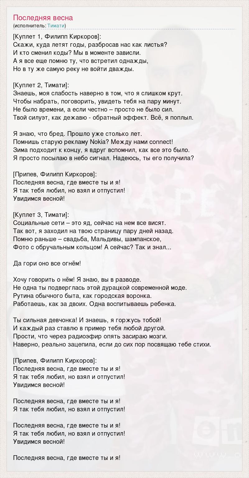 [Куплет 1, Филипп Киркоров]: Скажи, куда летят годы, разбросав нас как листья? И кто сменил коды? Мы в моменте зависли. А я все еще помню ту, что встретил однажды, Но в ту же самую реку не войти дважды. [Куплет 2, Тимати]: Знаешь, моя слабость наверно в том, что я слишком крут. Чтобы набрать, поговорить, увидеть тебя на пару минут. Не было времени, а если честно – просто не было сил. Твой силуэт, как дежавю - обратный эффект. Всё, я поплыл. Я знаю, что бред. Прошло уже столько лет. Помнишь старую рекламу Nokia? Между нами connect! Зима подходит к концу, я вдруг вспомнил, как все это было. Я просто посылаю в небо сигнал. Надеюсь, ты его получила? [Припев, Филипп Киркоров]: Последняя весна, где вместе ты и я! Я так тебя любил, но взял и отпустил! Увидимся весной! [Куплет 3, Тимати]: Социальные сети – это яд, сейчас на нем все висят. Так вот, я заходил на твою страницу пару дней назад. Помню раньше – свадьба, Мальдивы, шампанское, Фото с обручальным кольцом! А сейчас? Так и знал... Да гори оно все огнём! Хочу говорить о нём! Я знаю, вы в разводе. Не одна ты подверглась этой дурацкой современной моде. Рутина обычного быта, как городская воронка. Работаешь, как за двоих. Одна воспитываешь ребенка. Ты сильная девчонка! И знаешь, я горжусь тобой! И каждый раз ставлю в пример тебя любой другой. Прости, что через радиоэфир опять засираю мозги. Наверно, реально зацепила, если до сих пор посвящаю тебе стихи. [Припев, Филипп Киркоров]: Последняя весна, где вместе ты и я! Я так тебя любил, но взял и отпустил! Увидимся весной! Последняя весна, где вместе ты и я! Я так тебя любил, но взял и отпустил! Последняя весна, где вместе ты и я! Я так тебя любил, но взял и отпустил! Увидимся весной! Последняя весна, где вместе ты и я!