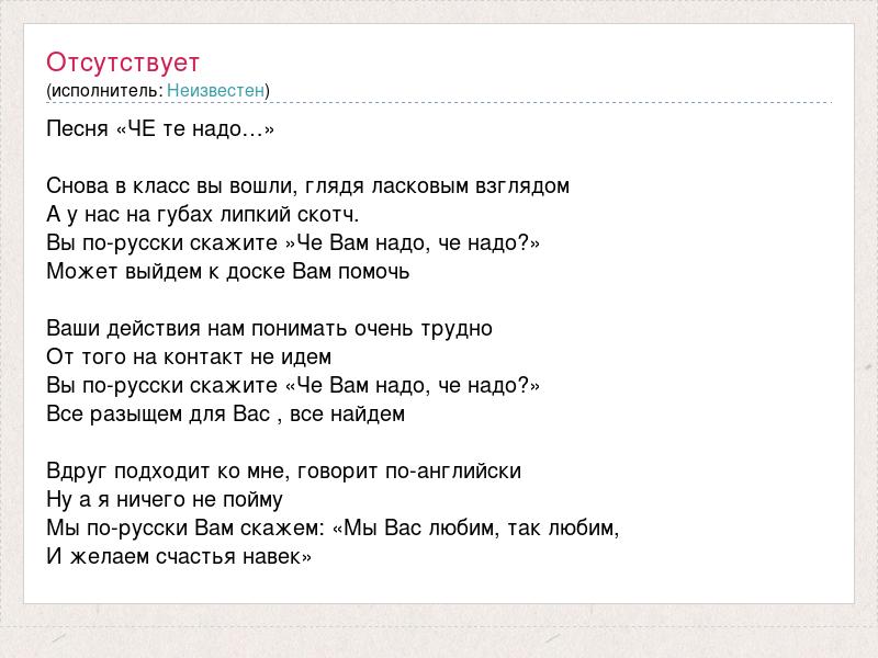 Песня «ЧЕ те надо…» Снова в класс вы вошли, глядя ласковым взглядом А у нас на губах липкий скотч. Вы по-русски скажите »Че Вам надо, че надо?» Может выйдем к доске Вам помочь Ваши действия нам понимать очень трудно От того на контакт не идем Вы по-русски скажите «Че Вам надо, че надо?» Все разыщем для Вас , все найдем Вдруг подходит ко мне, говорит по-английски Ну а я ничего не пойму Мы по-русски Вам скажем: «Мы Вас любим, так любим, И желаем счастья навек»