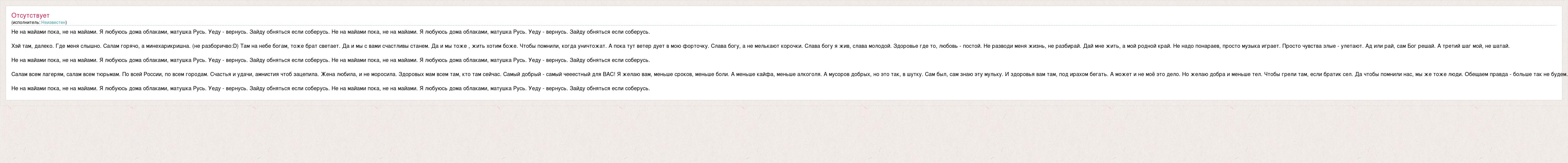 Не на майами пока, не на майами. Я любуюсь дома облаками, матушка Русь. Уеду - вернусь. Зайду обняться если соберусь. Не на майами пока, не на майами. Я любуюсь дома облаками, матушка Русь. Уеду - вернусь. Зайду обняться если соберусь. Хэй там, далеко. Где меня слышно. Салам горячо, а минехарикришна. (не разборичво:D) Там на небе богам, тоже брат светает. Да и мы с вами счастливы станем. Да и мы тоже , жить хотим боже. Чтобы помнили, когда уничтожат. А пока тут ветер дует в мою форточку. Слава богу, а не мелькают корочки. Слава богу я жив, слава молодой. Здоровье где то, любовь - постой. Не разводи меня жизнь, не разбирай. Дай мне жить, а мой родной край. Не надо понараев, просто музыка играет. Просто чувства злые - улетают. Ад или рай, сам Бог решай. А третий шаг мой, не шатай. Не на майами пока, не на майами. Я любуюсь дома облаками, матушка Русь. Уеду - вернусь. Зайду обняться если соберусь. Не на майами пока, не на майами. Я любуюсь дома облаками, матушка Русь. Уеду - вернусь. Зайду обняться если соберусь. Салам всем лагерям, салам всем тюрьмам. По всей России, по всем городам. Счастья и удачи, амнистия чтоб зацепила. Жена любила, и не моросила. Здоровых мам всем там, кто там сейчас. Самый добрый - самый чееестный для ВАС! Я желаю вам, меньше сроков, меньше боли. А меньше кайфа, меньше алкоголя. А мусоров добрых, но это так, в шутку. Сам был, сам знаю эту мульку. И здоровья вам там, под ирахом бегать. А может и не моё это дело. Но желаю добра и меньше тел. Чтобы грели там, если братик сел. Да чтобы помнили нас, мы же тоже люди. Обещаем правда - больше так не будем. Не на майами пока, не на майами. Я любуюсь дома облаками, матушка Русь. Уеду - вернусь. Зайду обняться если соберусь. Не на майами пока, не на майами. Я любуюсь дома облаками, матушка Русь. Уеду - вернусь. Зайду обняться если соберусь.